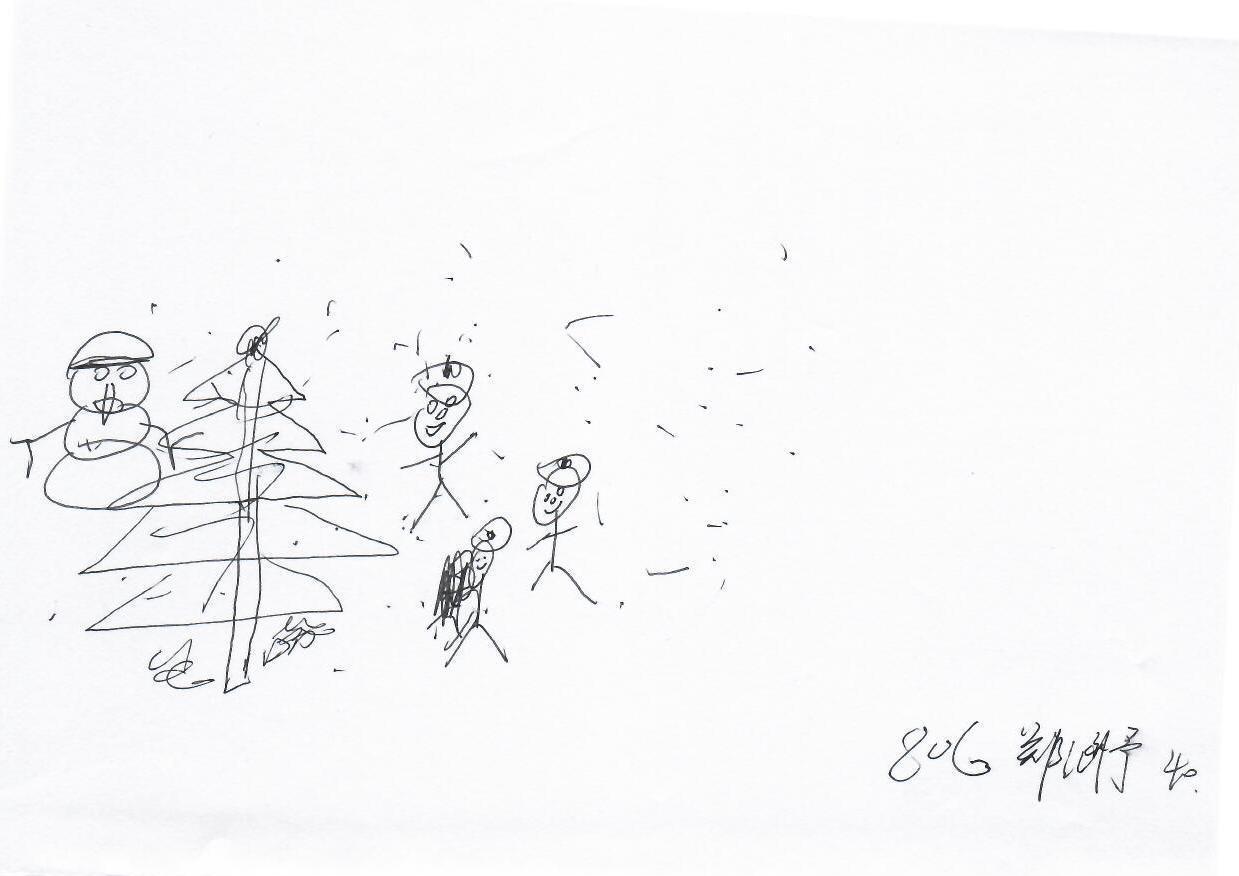 这幅作品是一幅儿童画,简单的线条勾勒出了一个圣诞树和几个人物。画面中有飘落的雪花,营造出冬季节日的氛围。人物的表情简单而快乐,可能是在表现节日的欢庆。整体画面充满了童真和无忧无虑的情感。