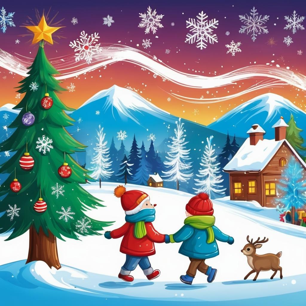 这幅作品以其简单的线条和形状传达了儿童特有的单纯和快乐。可以通过加入更多的色彩和细节来增强这种节日的气氛。例如,使用明亮的红色和绿色装饰圣诞树,给人物添加围巾和帽子来增强冬季的感觉。同时,可以在背景中加入更多的雪花以及一些小动物,如小鸟或鹿,以丰富画面的内容和层次。通过这些元素的加入,画面将更具动感和趣味性,能够更好地传达节日的欢乐与温馨。