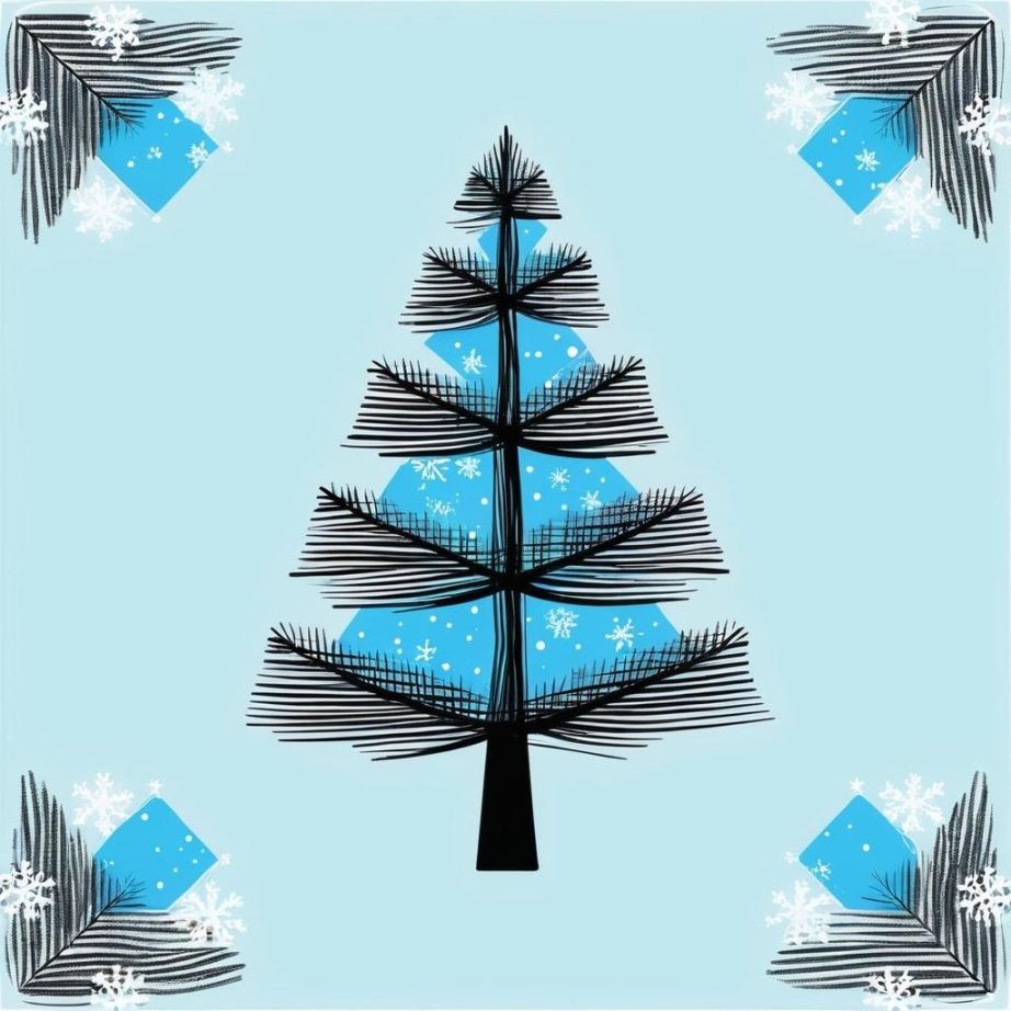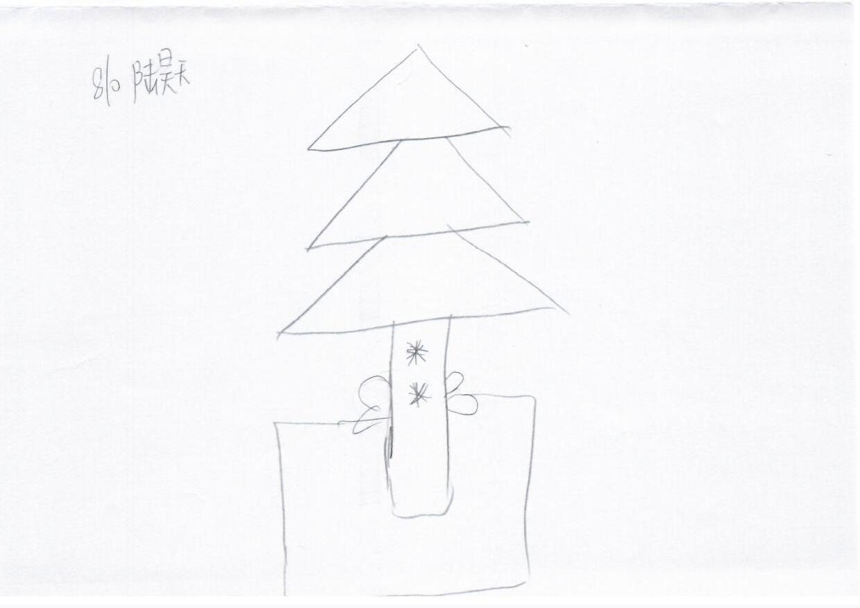 这幅图展示了一棵简单的圣诞树,主要由几何形状构成,树干上有星星图案,位于一个方形的花盆中。整体风格极简,线条干净,给人一种纯真的感觉,可能反映了创作者的童真或是对节日的期待。
