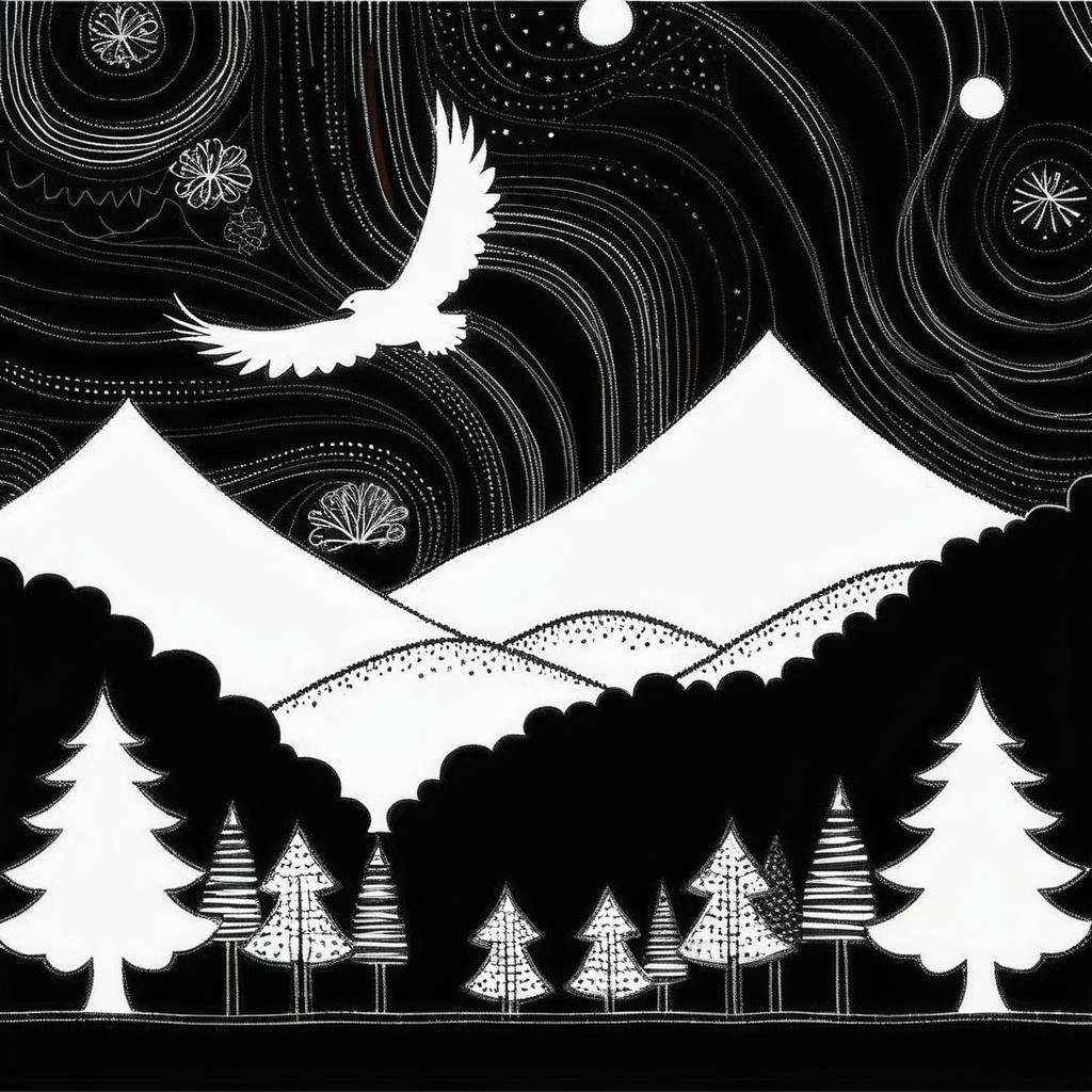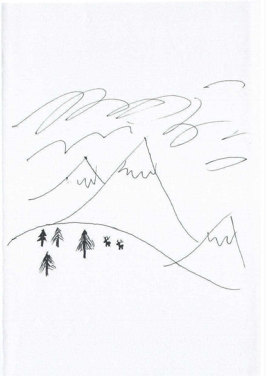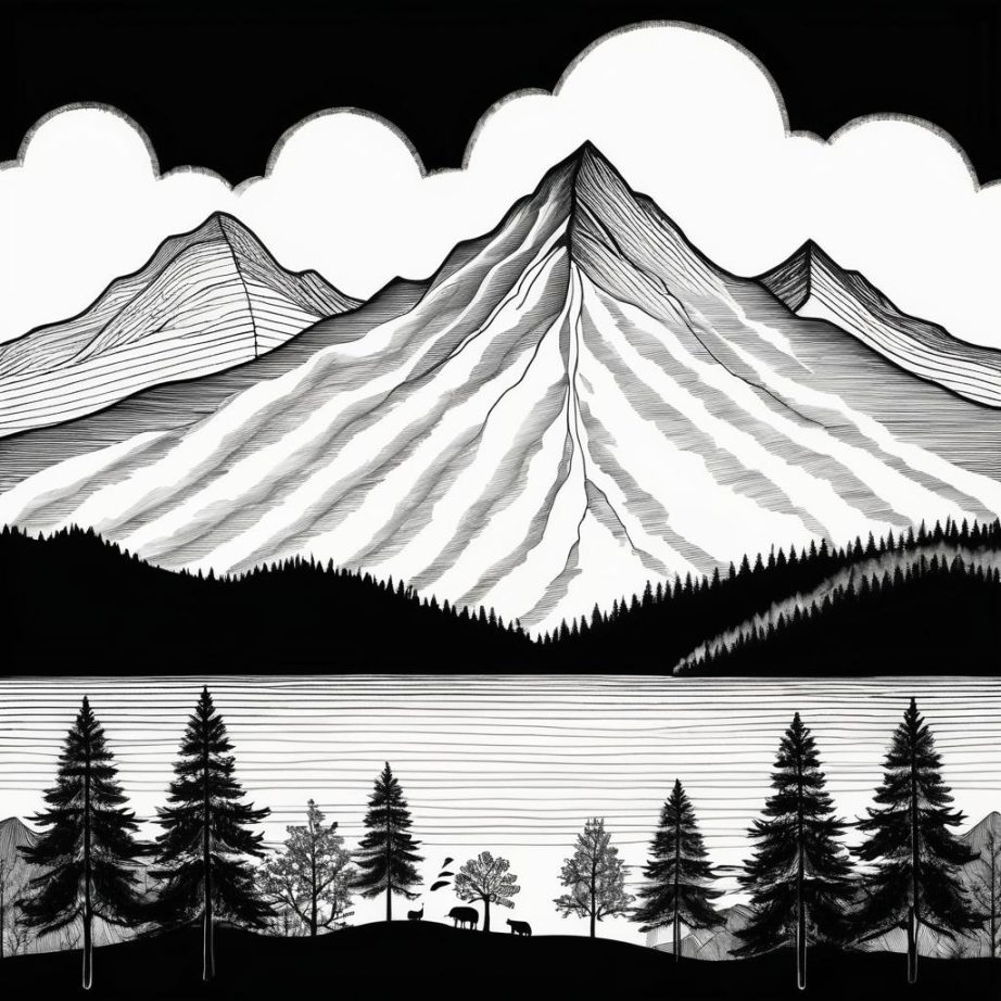 这幅画采用了简单的线条来描绘山脉、树木和动物。画面中的元素以黑白对比呈现,构图简约,具有一种原始自然的氛围。创作者可能想表达一种对大自然的纯粹欣赏和童趣般的视角。