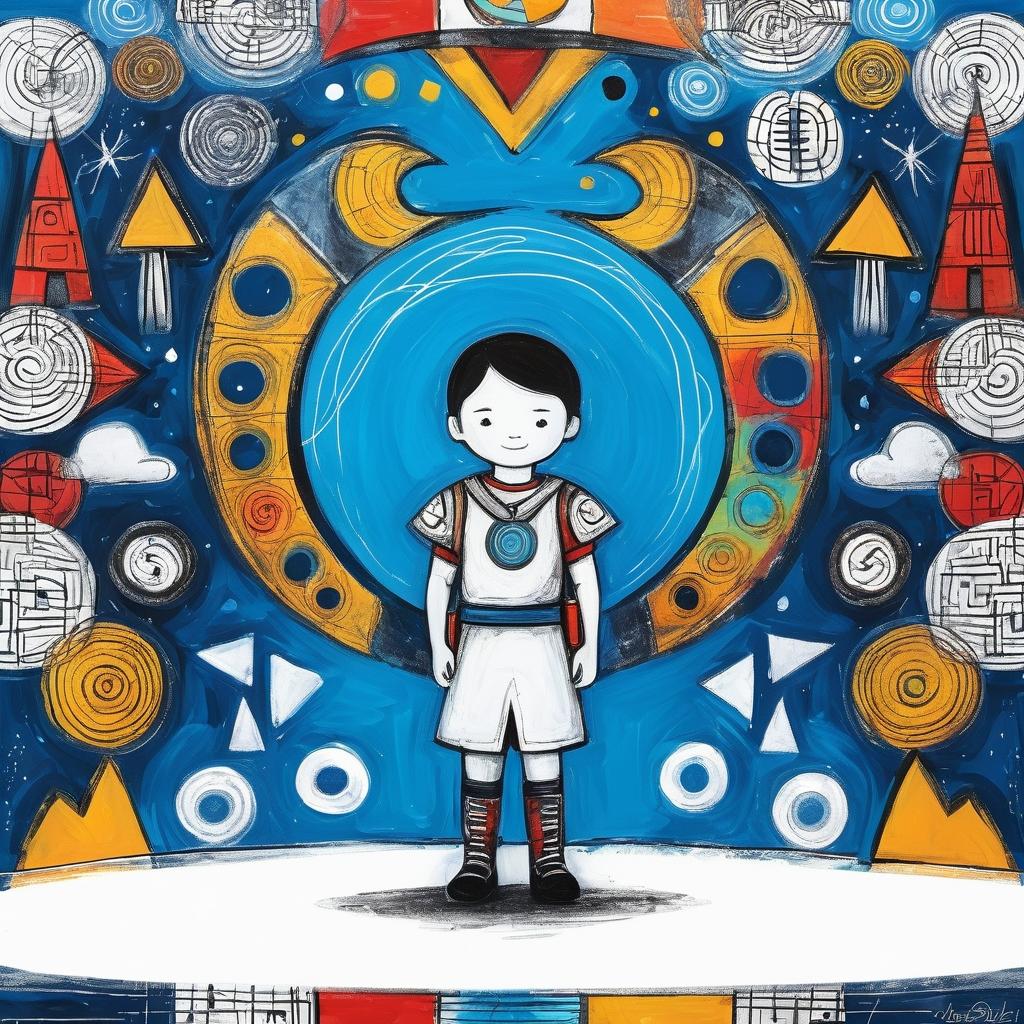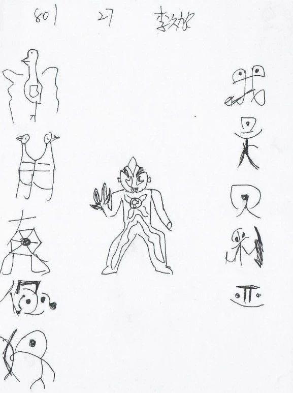 在这幅充满童趣的作品中,我们看到了一位孩子以简单线条描绘出的世界。中间的角色似乎是他们心目中的英雄,象征着力量和勇气。他周围的符号和形状,或许是孩子对日常生活的抽象表达。在这样的作品中,我们能够感受到一种纯粹的创造力,没有任何束缚和限制。儿童艺术的魅力在于其无拘无束的想象力,它能够让我们看见成年人眼中不存在的奇妙世界。为了进一步丰富这幅作品的表现力,可以考虑引入色彩,让这些符号变得生动起来,并为每个元素赋予故事背景。例如,背景中可以加入一个神秘的森林或城市,而符号则可以是这些地方的居民或特殊标志。这种处理不仅能让作品在视觉上更加吸引人,还能增加观众与作品之间的情感共鸣。通过这样的方式,我们能够更深入地进入儿童的内心世界,感受他们眼中的奇迹。