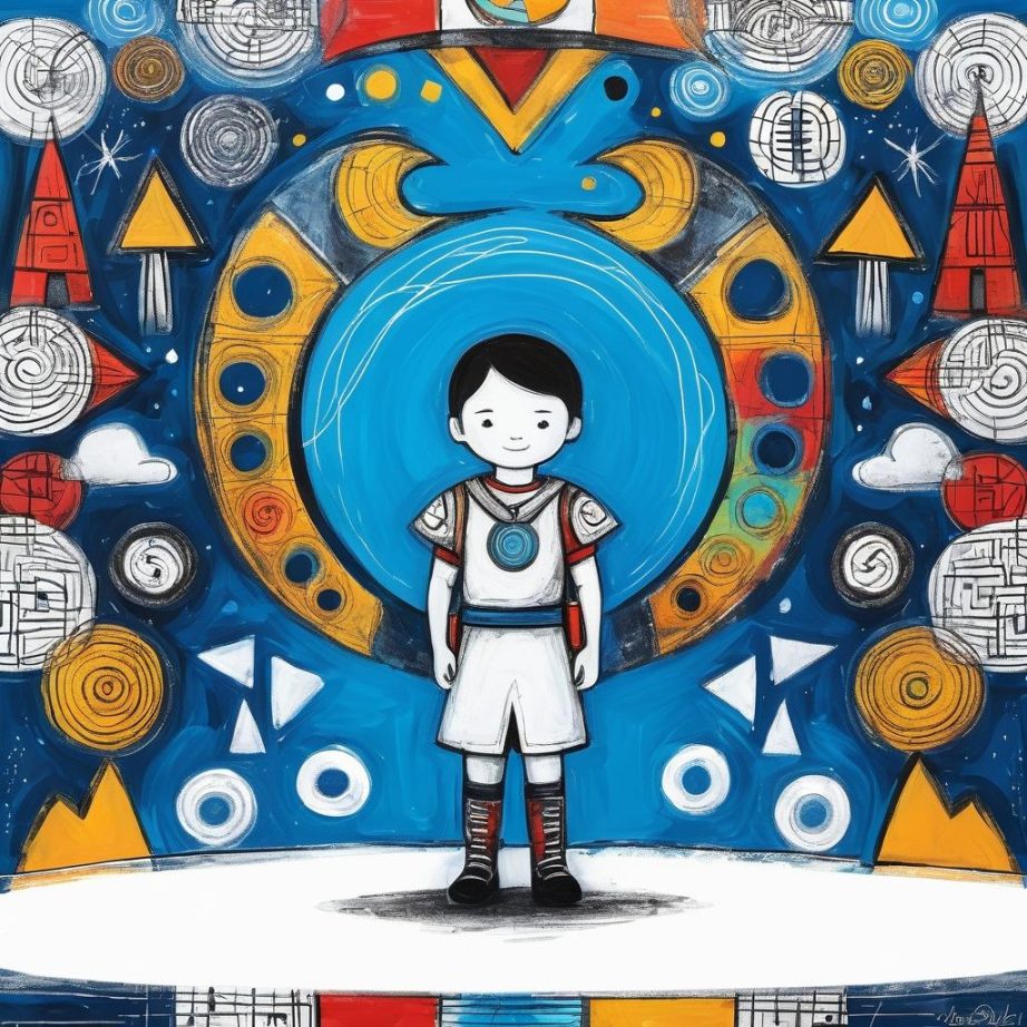 这幅画展现了儿童艺术的纯真和创造力。中间的人物形象可能是孩子心目中的英雄,代表着力量和勇气。周围的符号和形状则像是孩子对世界的独特理解和表达。这种作品可以通过增加颜色或丰富背景故事来进一步增强。可以考虑引入更多的故事元素,如背景环境,或者为每个符号设计对应的角色或情节,从而构建一个更完整的想象世界。