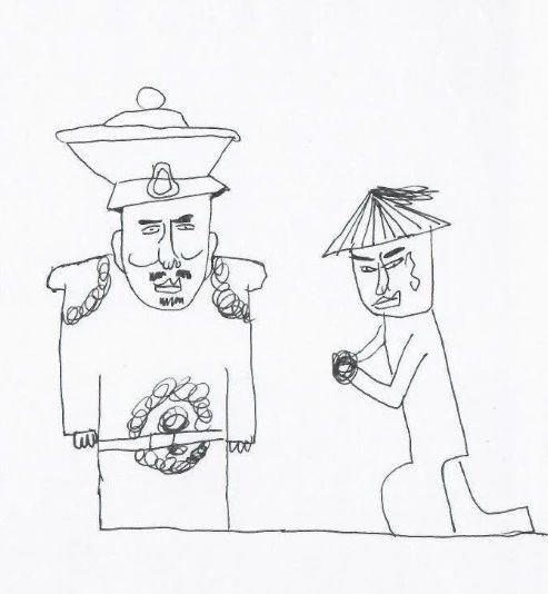 这幅画以简单的线条勾勒出两个主要人物。左侧人物身着军装,戴有帽子,右侧人物跪地,头戴斗笠,神情似乎在哭泣或祈求。整个画面呈现出一种对比强烈的情感张力,可能在表现某种权力与屈服之间的关系。