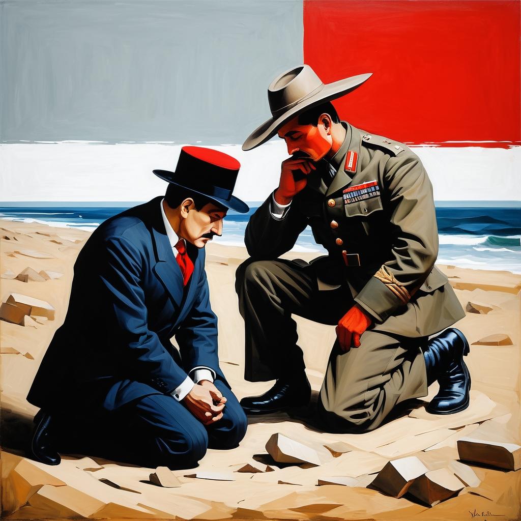 这幅简单却充满力量的画作,通过极简的线条和清晰的构图,表现出一种历史的对立情感。画中的两个人物被简化为几何形状,左边的军人象征着强权与高高在上,而右边跪地的普通人则展现了屈从与无奈。这种对比不仅体现在姿态上,也深深扎根于情感的表达。艺术的魅力在于其通过简单的形式传达复杂的情感。为了让这幅作品更具深度,可以加入一些历史背景元素,例如特定时期的建筑或标志性符号,以增强观者的代入感。色彩的运用也可以进一步丰富作品的情感层次,例如使用红色来象征革命或反抗,黑色则代表压抑或悲剧。此外,通过细致描绘人物的表情和服饰,可以使画面更具动态感和真实感。这样,这幅作品不仅在视觉上吸引人,更在情感和思想上引发深思。