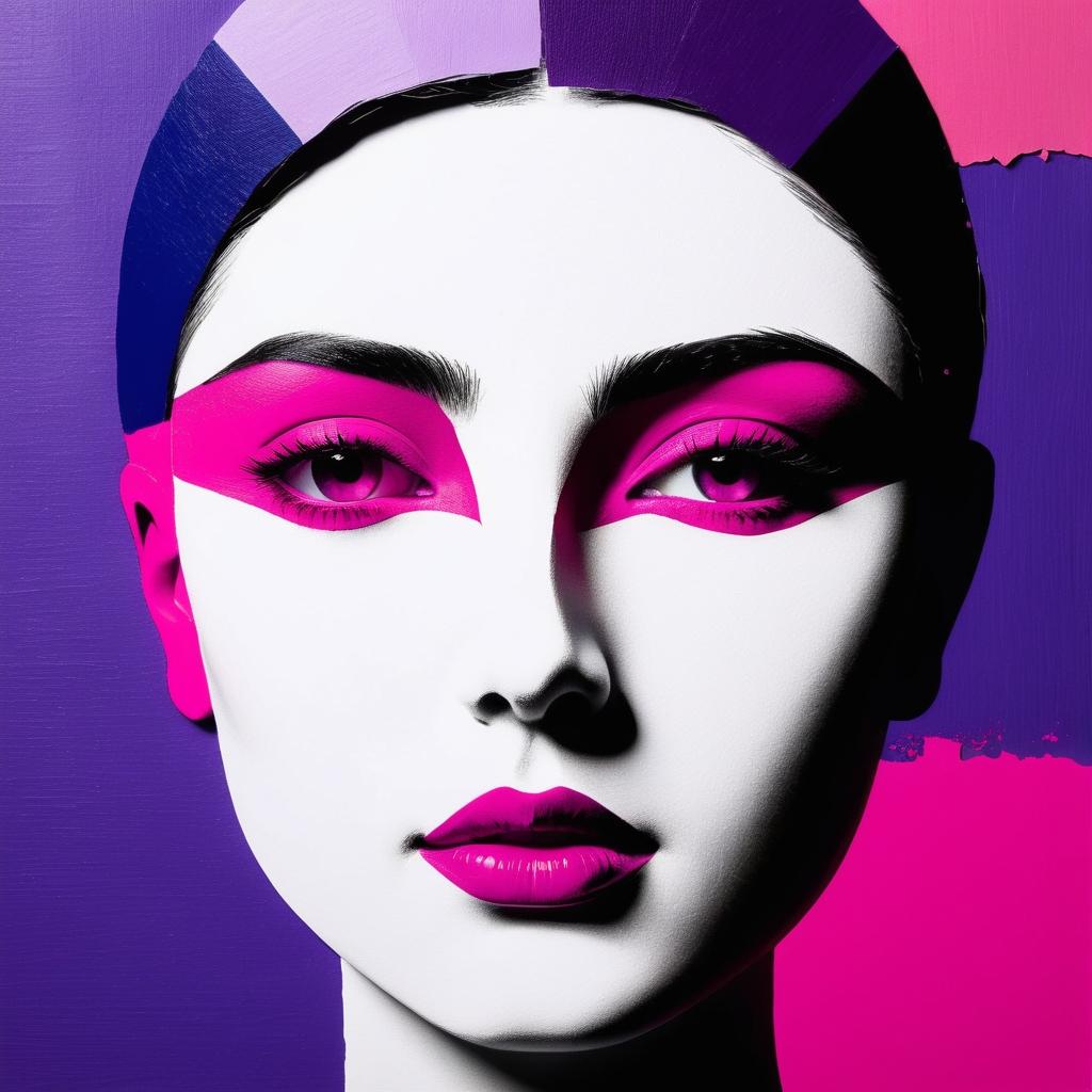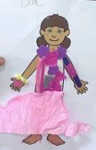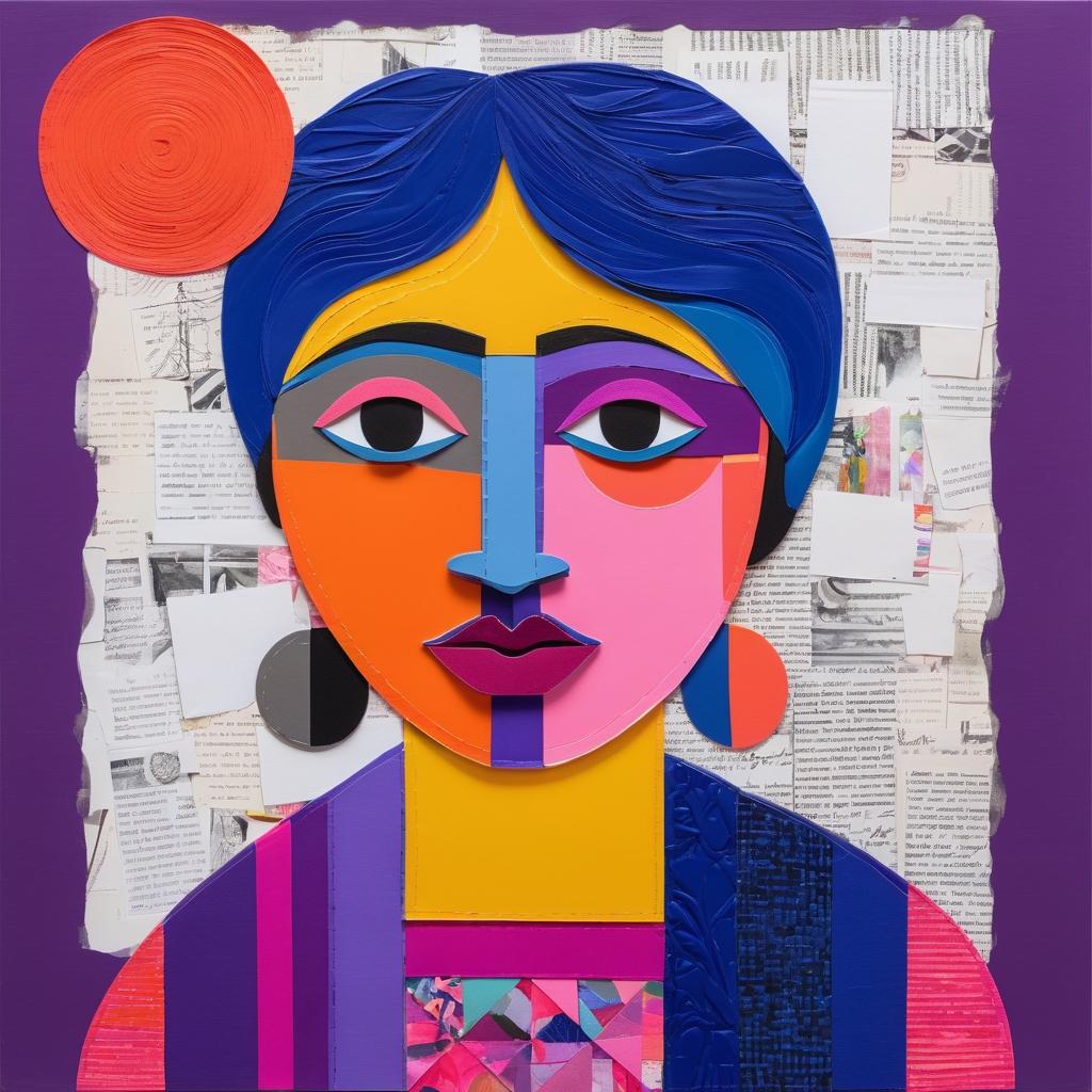 这幅作品是一幅混合媒介的儿童拼贴画,主要以粉色和紫色为主色调。作品展示了一位人物形象,可能是通过纸片和其他材质拼贴而成,传达出天真和创造力的气息。背景简单,突出人物本身的设计。