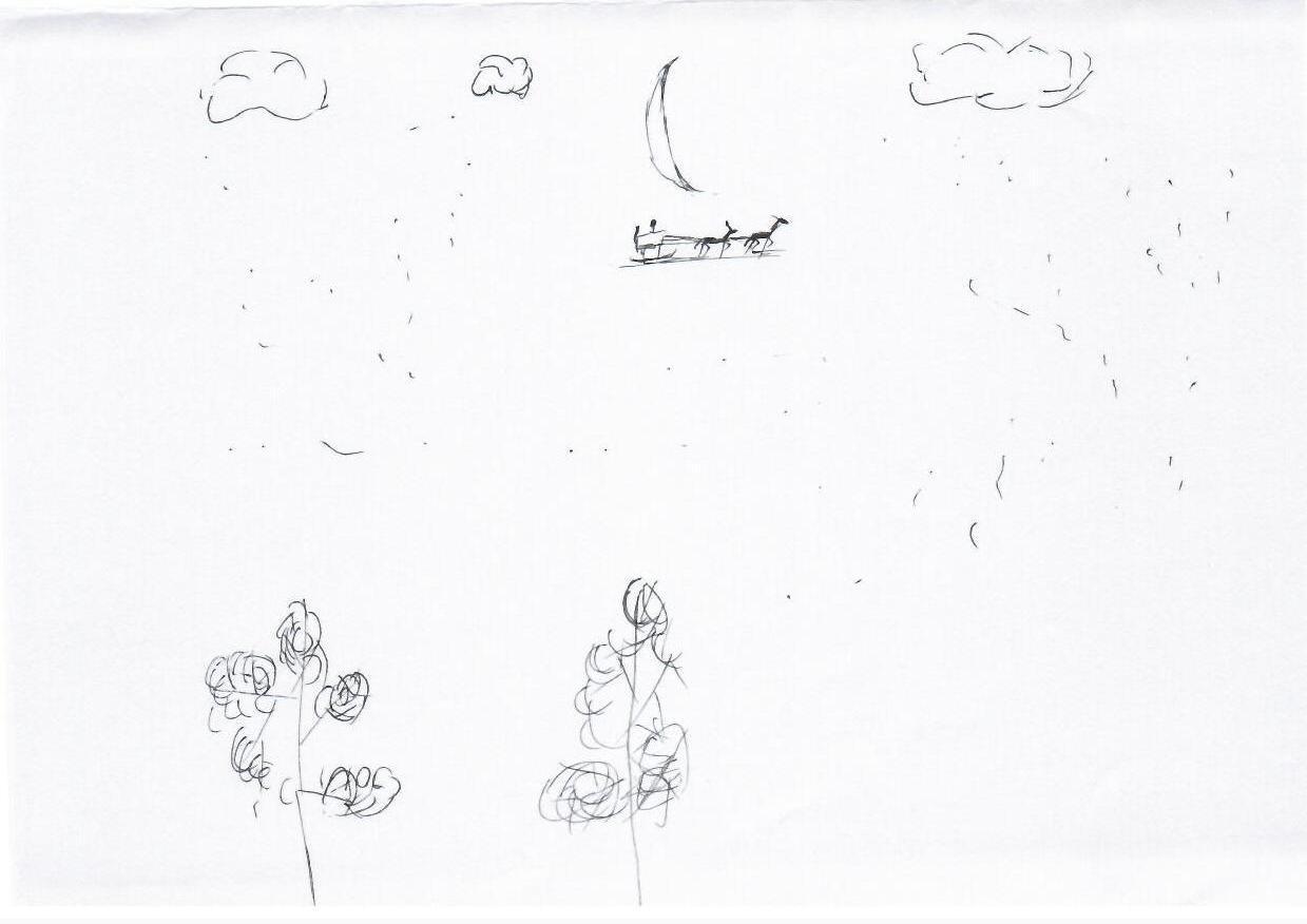 这幅作品通过简单的线条与空白的背景,呈现出一种纯真的童趣。可以从中感受到一种轻松和无拘无束的创作态度。为了提升作品,可以考虑增加一些色彩,特别是在树木和天空中,运用柔和的蓝色和绿色调,强化自然的生机。此外,适当增加细节,如星星或更丰富的云朵形态,能为画面提供更多的层次感。整体上,保持这种简单而纯粹的风格,但通过颜色和细节的丰富,使其更具视觉吸引力和故事性。