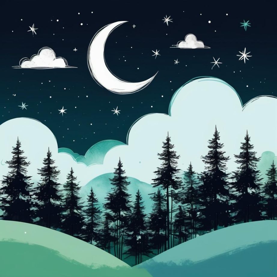 这幅作品以简单的线条勾勒出自然景观,包含树木、云朵和一个月亮,构图简洁。创作者可能在表达一种宁静的夜晚氛围,通过稀疏的元素营造出空旷与静谧。