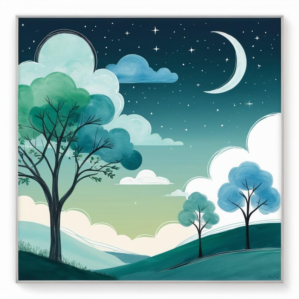 这幅作品以简洁的线条和空白的背景呈现出一种宁静的夜晚景象。它的独特之处在于使用稀疏的元素,如树木、云朵和月亮,来传达一种轻松和无拘无束的氛围。这种风格常见于儿童艺术中,强调直观的表现和纯真的情感表达。为了进一步提升这幅作品的艺术性,可以考虑通过色彩和细节的丰富来增强视觉吸引力。使用柔和的蓝色和绿色为树木和天空增添生机,同时增加星星或更丰富的云朵形态,创造出更多的层次感。这样的改进不仅保持了原作的纯粹风格,还为观者提供了一个更具吸引力的视觉体验。这种方法能够帮助儿童在创作中探索更多的表达方式,同时保持他们独特的艺术视角。通过这种方式,简单的线条画可以转变为一个充满故事性的艺术作品,既能吸引观众的眼球,又能触动他们的心灵。