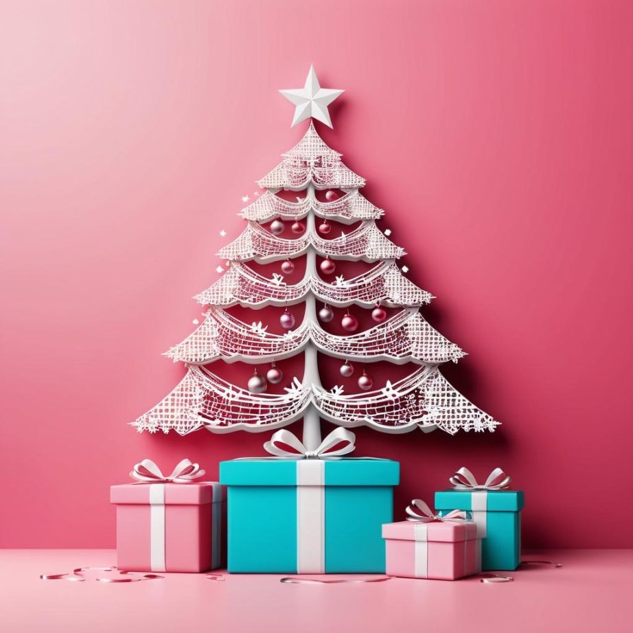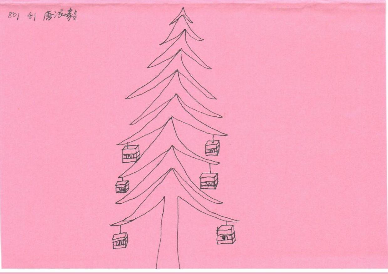 这幅作品简单而富有童趣,采用了一棵圣诞树的基本轮廓,背景为粉红色。在线条勾勒的树枝上,悬挂着几个小礼物盒。整体风格简约,用色单一,但通过礼物盒的细节增添了趣味性。画作可能传达了一种节日的期待和欢乐气氛。