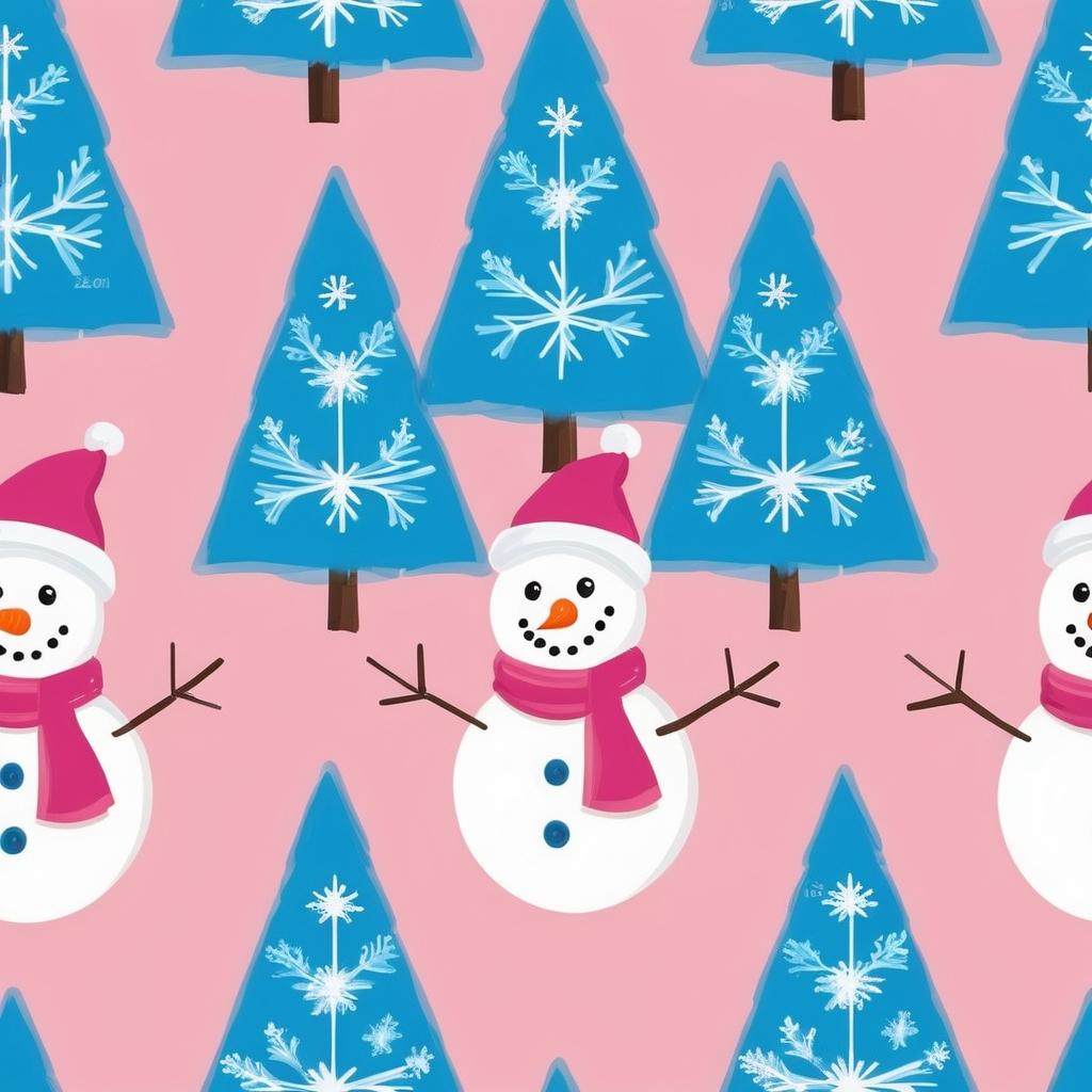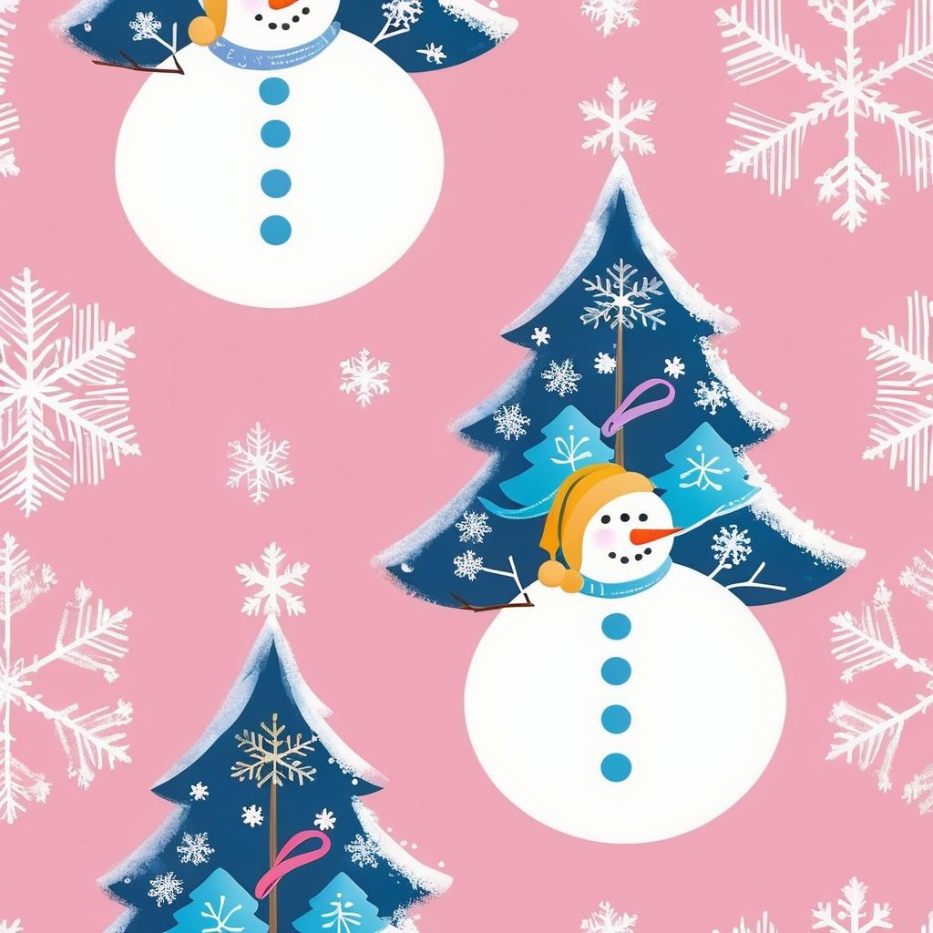 这幅作品采用简洁的线条描绘了一个雪人和两棵圣诞树,背景是粉红色的纸张。线条稚拙,展现了一种天真无邪的童趣。雪人的微笑表情和雪花的加入增添了冬日的氛围,同时粉色背景赋予画面一种温暖与柔和的对比。