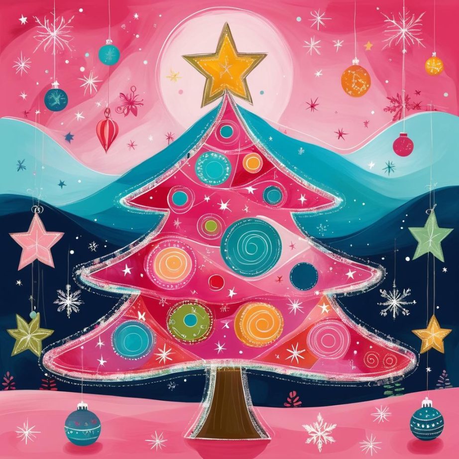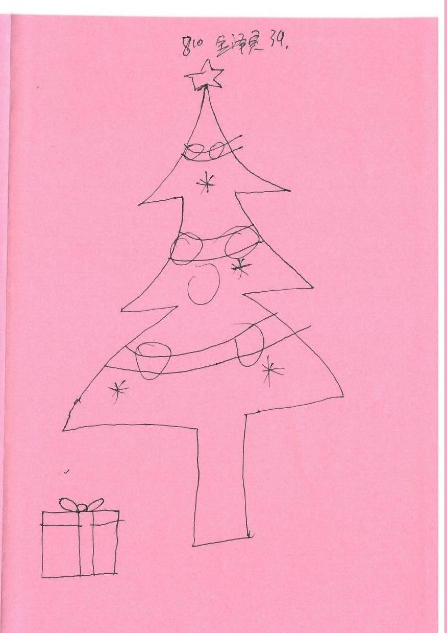 这幅作品使用简单的线条在粉色背景上勾勒出一棵圣诞树和一个礼物盒。圣诞树上有星星和圆形装饰,顶部有一颗星星。整体构图简单,传达了节日的欢乐气氛。