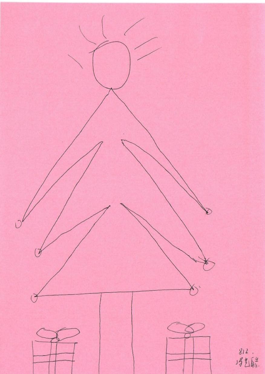 这幅画描绘了一棵圣诞树,由简单的线条和几何形状组成,背景为粉红色。树下有两个礼物盒,画面整体风格简约,可能是儿童或初学者的作品。作品传达了节日的喜悦与纯真。