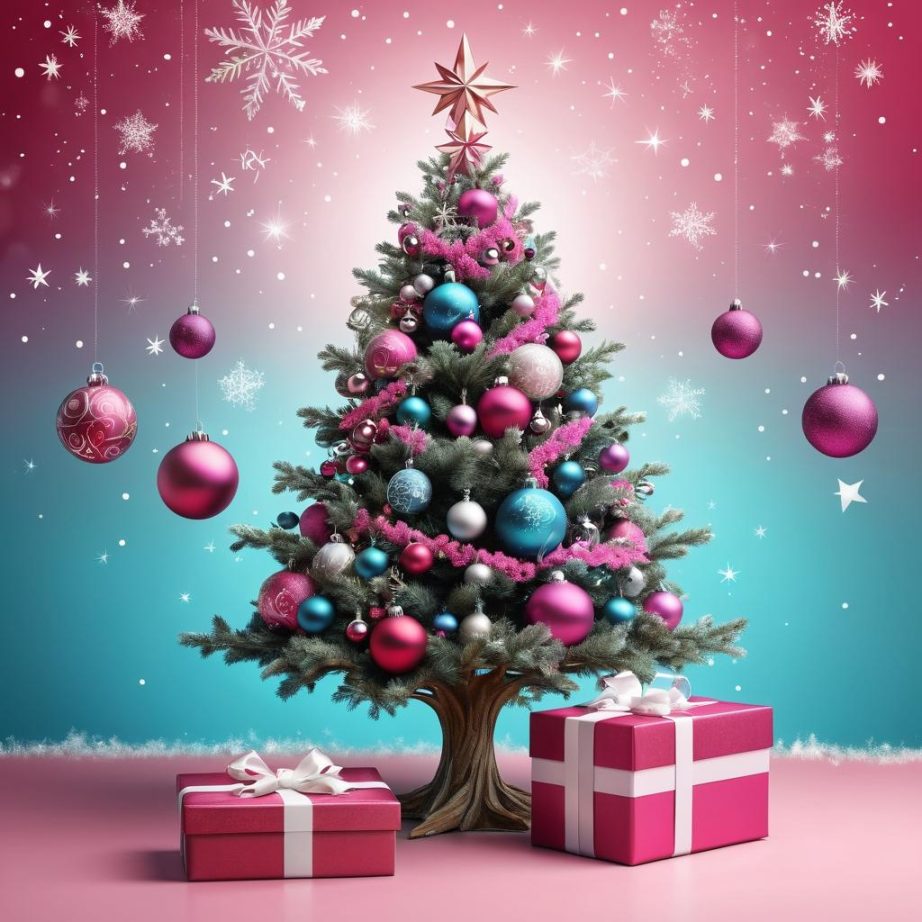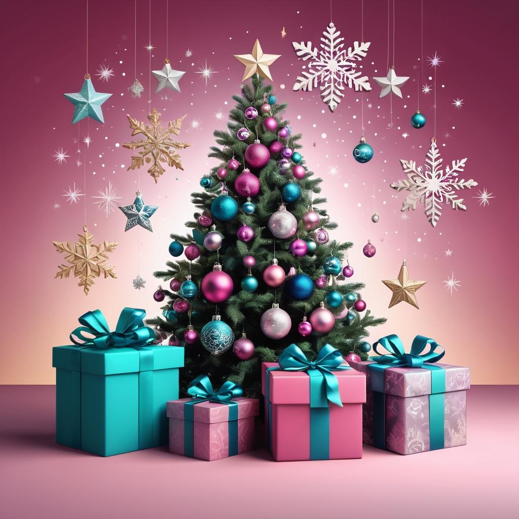 这幅画的核心在于其简单而纯粹的表达。粉红色的背景让观众感受到温暖与幸福,而树上的装饰以及星星的点缀则增添了节日的氛围。礼物盒象征着期待与惊喜,小簇植物则让整个画面充满生机。可以考虑在背景中加入更多的细节,比如雪花或是夜空的渐变色彩,以增加画面的层次感。同时,提升树的细节和装饰物的光影效果,将使画面更具立体感和视觉冲击力。