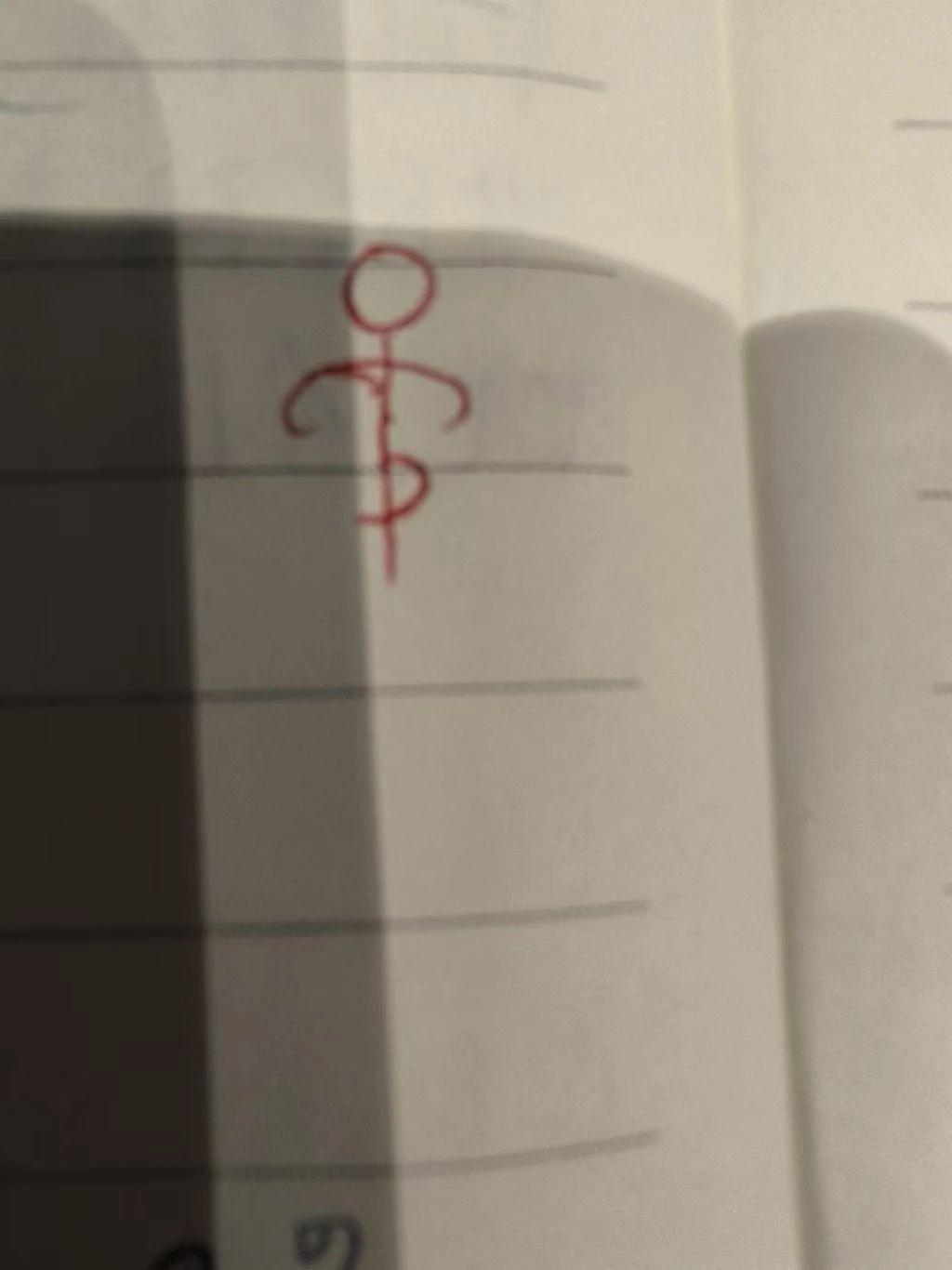 这幅图展示了一个简单的红色线条绘制的符号,位于笔记本纸上。符号由一个圆圈和类似于一个美元符号的垂直线条构成。背景是淡黄色的纸张,线条以深灰色阴影为背景。这种简单的构图可能传达了一种极简主义或抽象的概念。