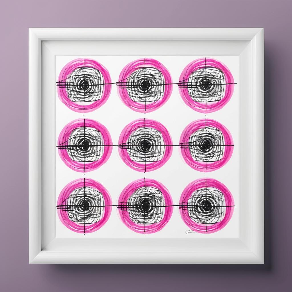 这幅作品展示了一种无拘无束的儿童创作风格,使用粉色背景和黑色线条勾勒出简单的圆形和线条。作品整体充满了稚嫩的童真和随意感,可能表达了某种简单的秩序感或是对某种排列的兴趣。