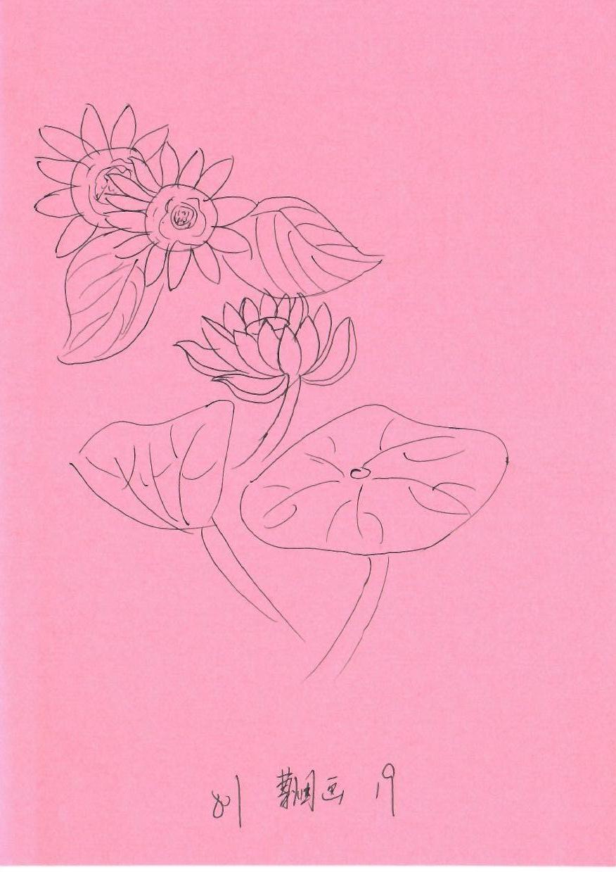这幅作品采用简洁的线条勾勒出荷花和莲叶,背景为粉色纸张,呈现出一种清新自然的感觉。荷花的形态生动,叶片的线条流畅,背景的粉色与黑色线条形成对比,给人一种平和且优雅的氛围。可能传达的主题是自然的美丽与生命的纯净。