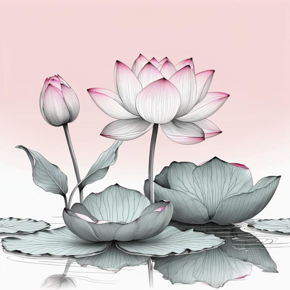 在这幅名为“粉色荷韵”的作品中,创作者通过简单的线条勾勒出荷花和莲叶,背景为柔和的粉色,整体给人一种清新自然的感觉。荷花作为自然界中优雅的象征,其生动的形态被细致的线条表现得淋漓尽致。粉色背景不仅增加了画面的柔和感,还与黑色线条形成对比,突显出荷花的纯净与美丽。