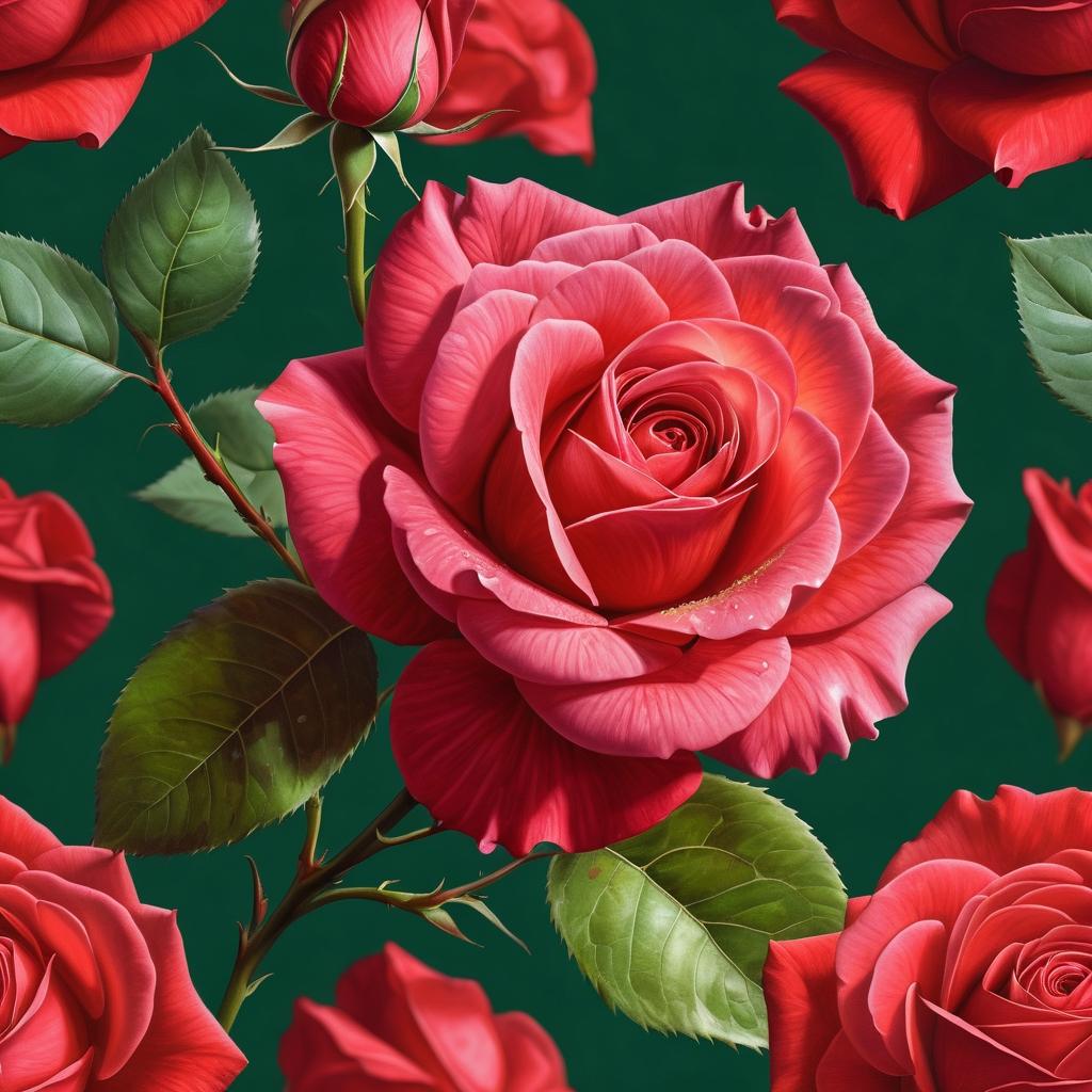 这幅作品以红玫瑰为主要元素,背景模糊,突出花朵的细节和色彩。鲜艳的红色与背景的绿色形成强烈对比,传达了爱情与热情的主题。画面中柔和的光线增加了整体的温暖感,同时也赋予玫瑰一种细腻的质感和层次感。