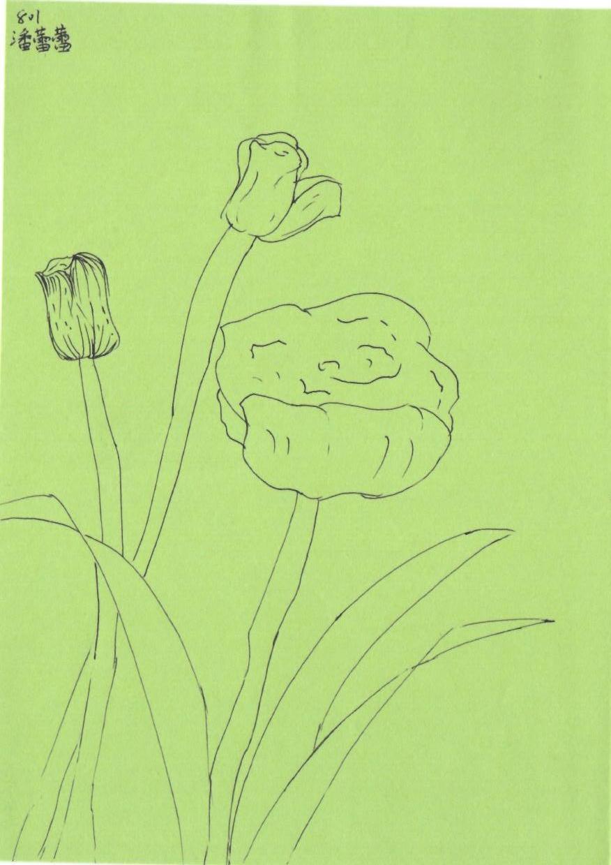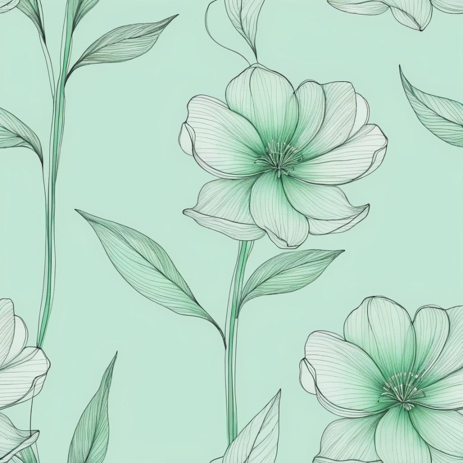 这幅作品使用简单的线条勾勒出花卉的形态,背景采用浅绿色纸张,给人一种自然和宁静的感觉。作品没有使用颜色填充,强调了线条的流畅和形状的简约。创作者可能意图通过这种简约的表达方式,突出自然的纯粹和花卉的本真美感。