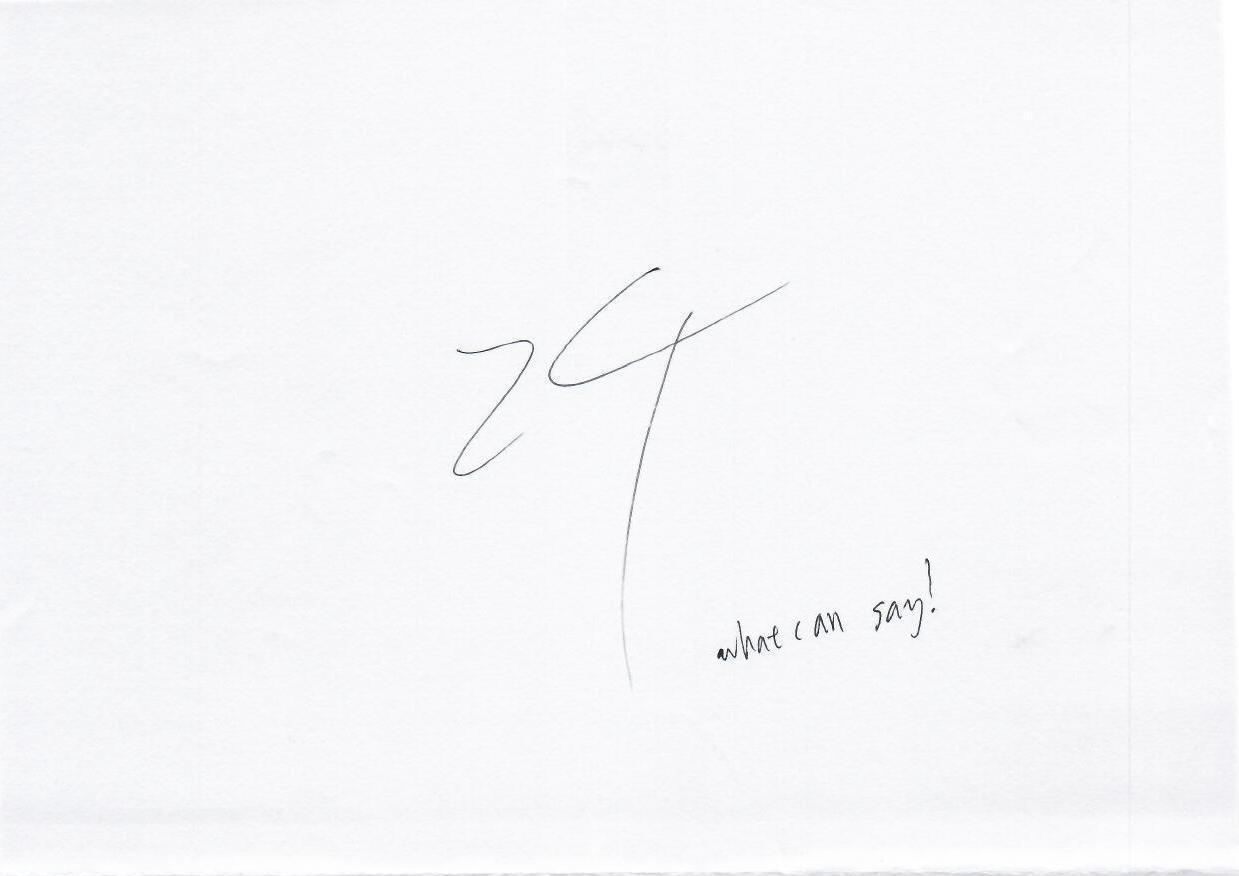 这幅作品以极简主义风格呈现,白色背景上有几笔简单的线条和文字。线条流畅而随意,文字写着 ‘what can I say!’,似乎在传达一种无奈或困惑的情绪。作品整体给人一种开放和探索的感觉,令人思考其背后的深意。