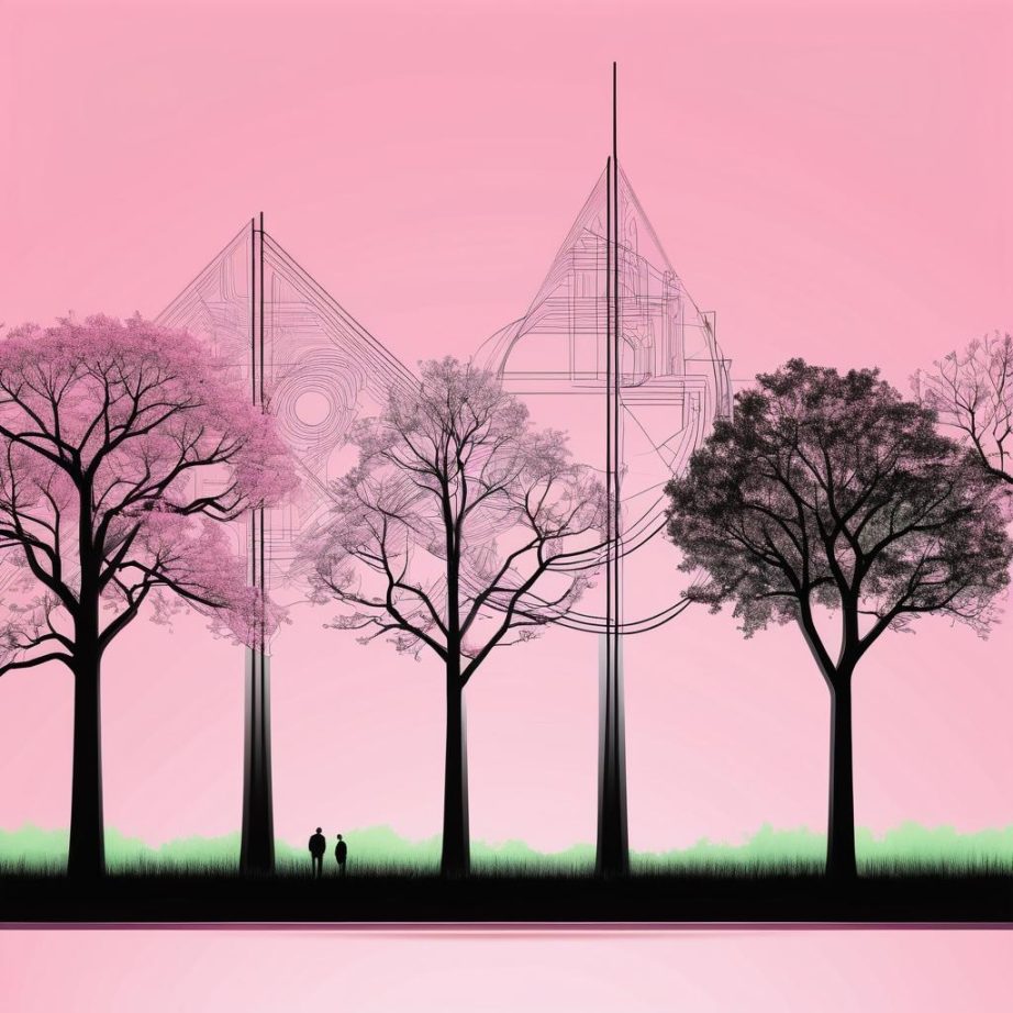 这幅作品以其简约的构图和富有想象力的表现手法引发观者的思考。背景纸的粉红色调为整幅作品带来柔和且温暖的基调,而简单的线条勾勒出电路图与树木的形象,则在科技与自然之间架起了一座桥梁。创作者巧妙地利用了几何图形的简洁性,使得作品在视觉上干净利落,同时也引发出一种童趣的氛围。
