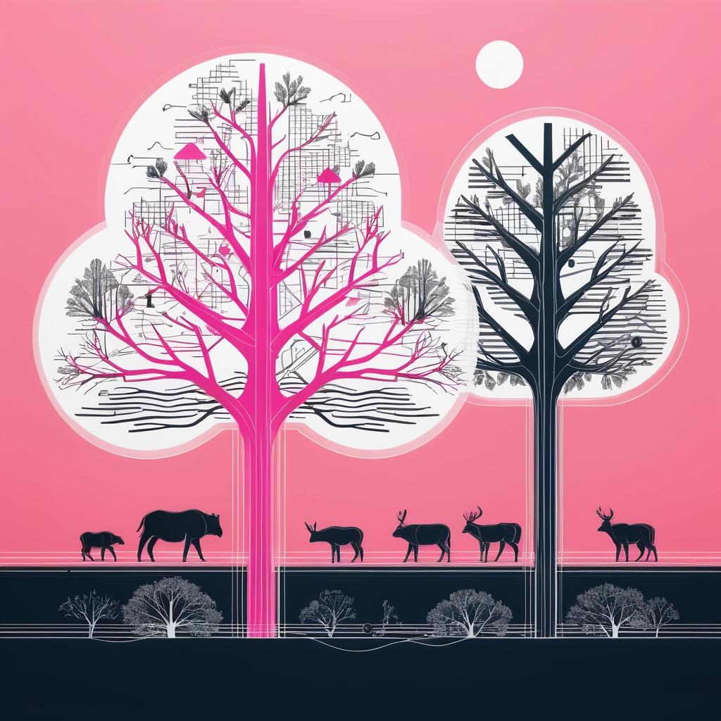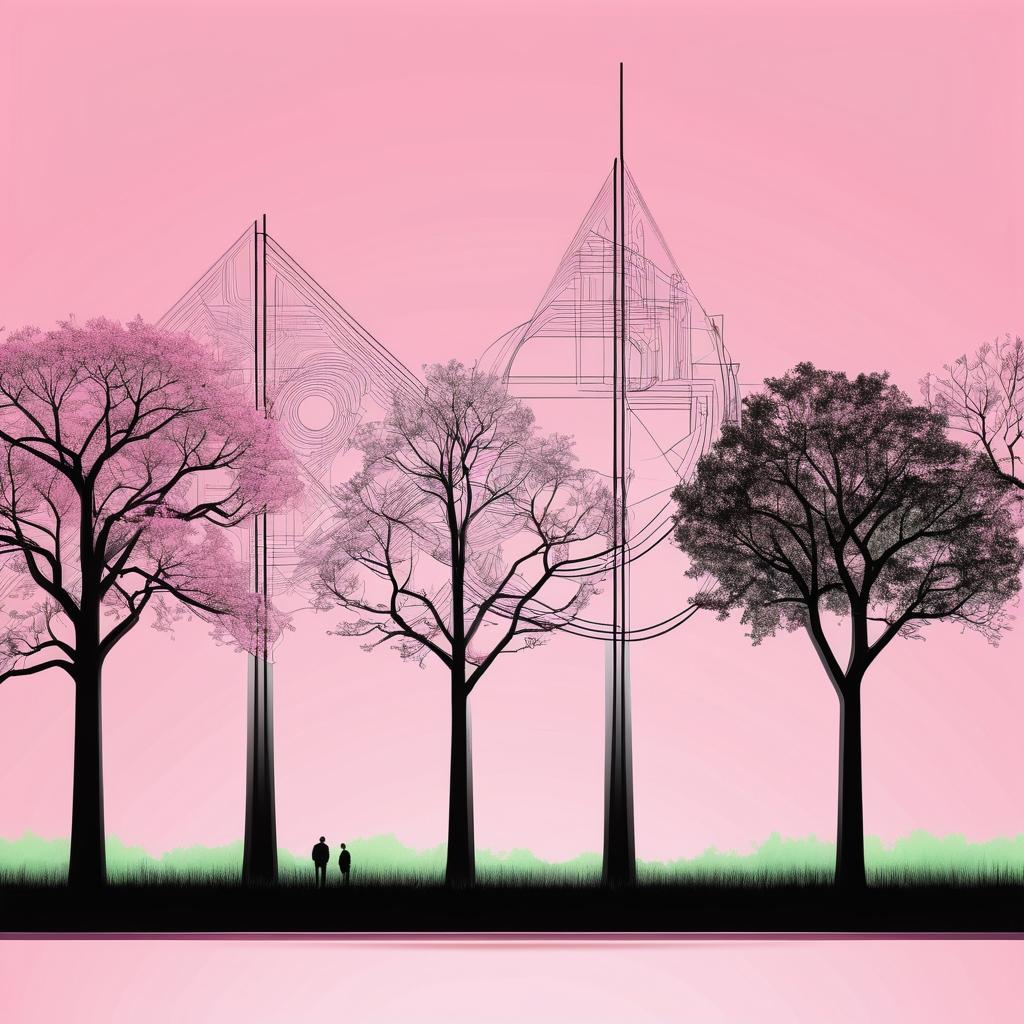 电路图象征着人类的智慧与科技的进步,而几何形状的树木则代表着自然界的生机与活力。这两者的结合不仅使作品充满了现代感,也传递出一种和谐共生的理念。为了进一步丰富作品的表现力,可以考虑在背景中加入色彩的渐变,象征时间的流逝,从而赋予作品更多的情感层次。同时,增加一些互动的小元素,比如小动物或人物角色,能够使作品更具生动性和故事性。