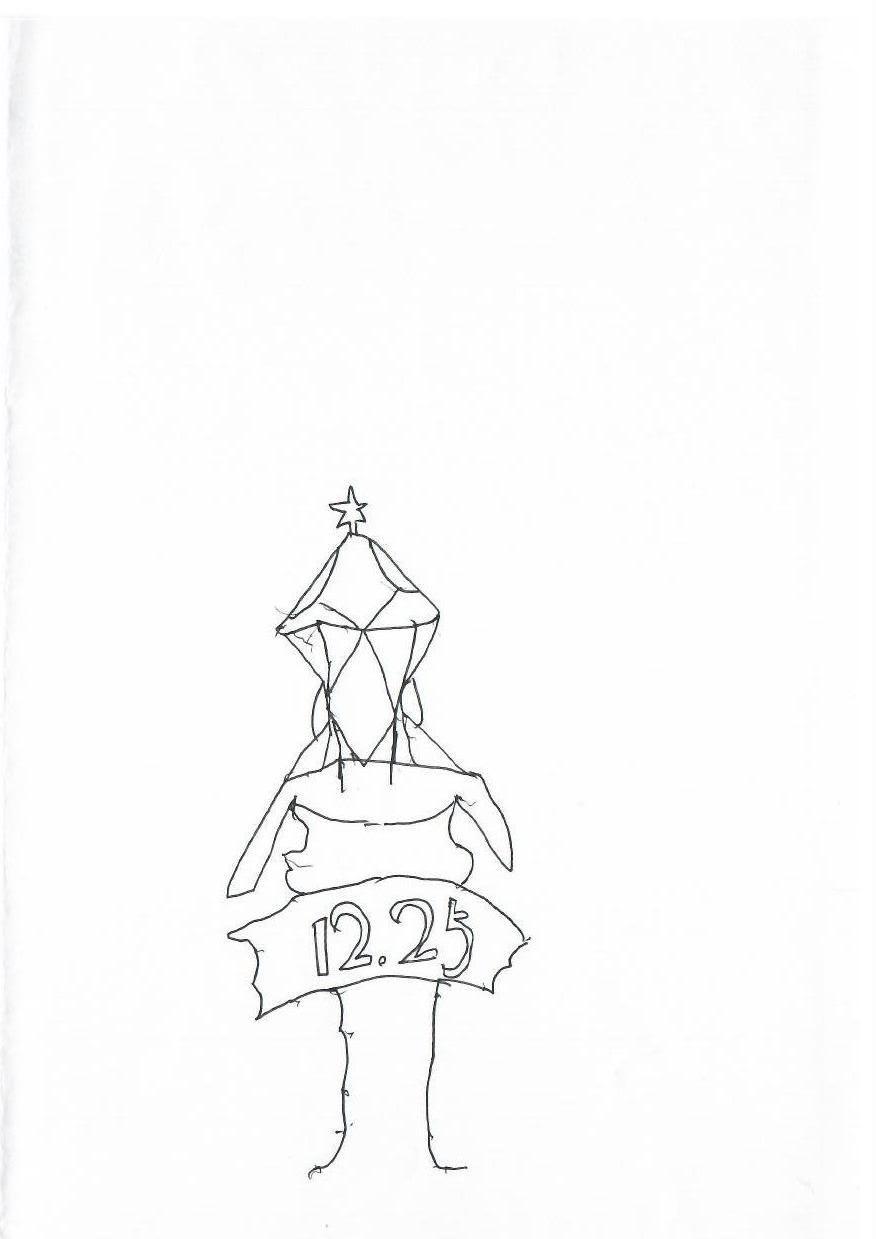 作品以简单的线条勾勒出一棵圣诞树的轮廓,顶部是一颗星星,树干部分用标记12.25的横幅装饰。整体设计简约,留白较多,传达了一种清新的节日气息。可能表达的主题是圣诞节的到来。