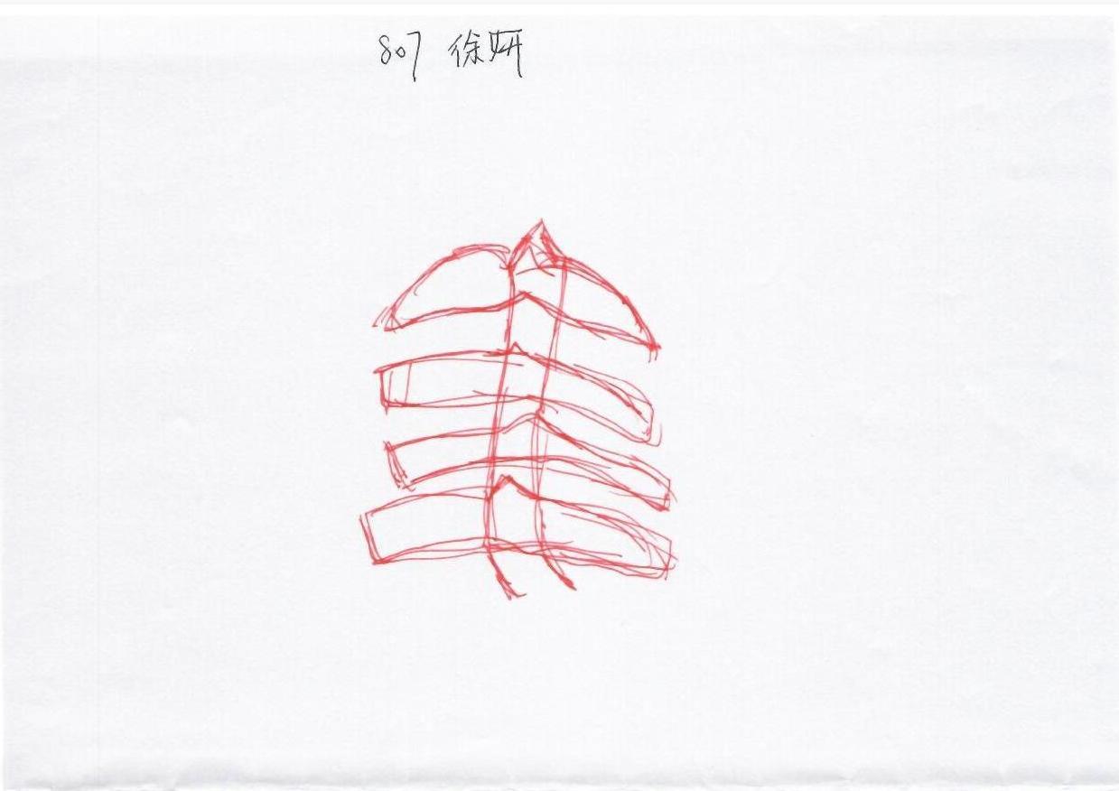 这幅作品以简单的红色线条描绘了一个抽象形状,可能代表着某种自然元素或符号。画面简洁,背景留白,给人一种开放与无限的感觉。线条的重复与交错似乎在传达一种韵律感和节奏感,可能暗示着某种生命的律动或自然的和谐。