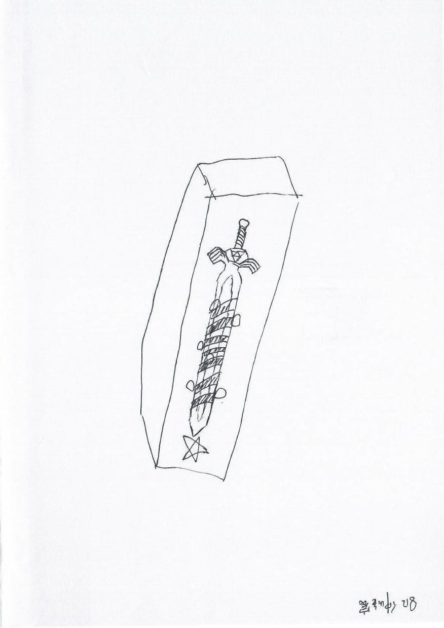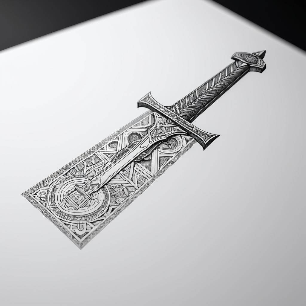 这幅作品中,主要元素是一把被线条简单勾勒出的剑,剑身饰有几何图案,整体放置在一个长方体中。画面采用了极简主义风格,通过简洁的线条传达出一种神秘和古老的感觉。可能是在探索力量、传承或神秘的主题。