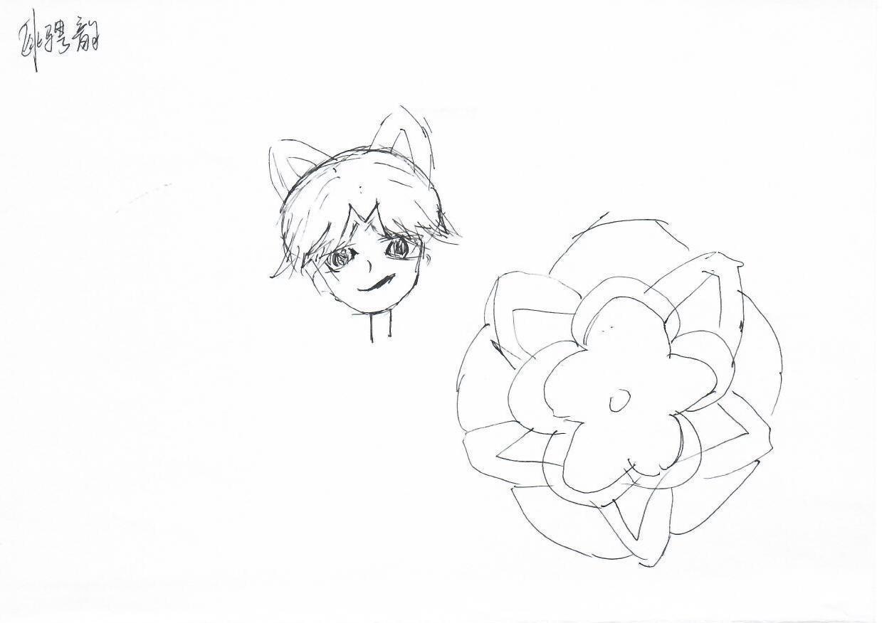 这幅画展示了一个简单的线条草图,包含一个带有猫耳的微笑面孔和一个花卉图案。线条简洁而富有表现力,给人一种轻松和愉悦的感觉。创作者可能试图通过这种可爱的形象传达一种纯真和天真。