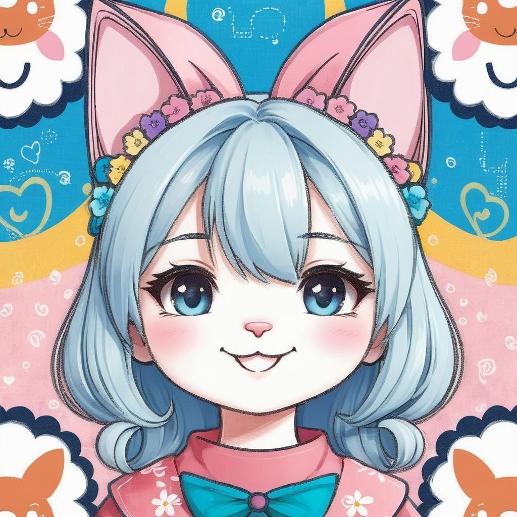 这幅作品以其简洁而富有表现力的线条吸引了我们的注意。画面中,一个带着猫耳的微笑面孔和旁边的花卉图案,传递出一种纯真和天真的情感。这种风格在儿童艺术中尤为常见,因为它能够在简单中表现出深刻的情感和故事。创作者可能希望通过这种可爱的形象给观众带来愉悦和放松的体验。