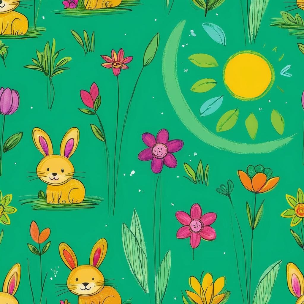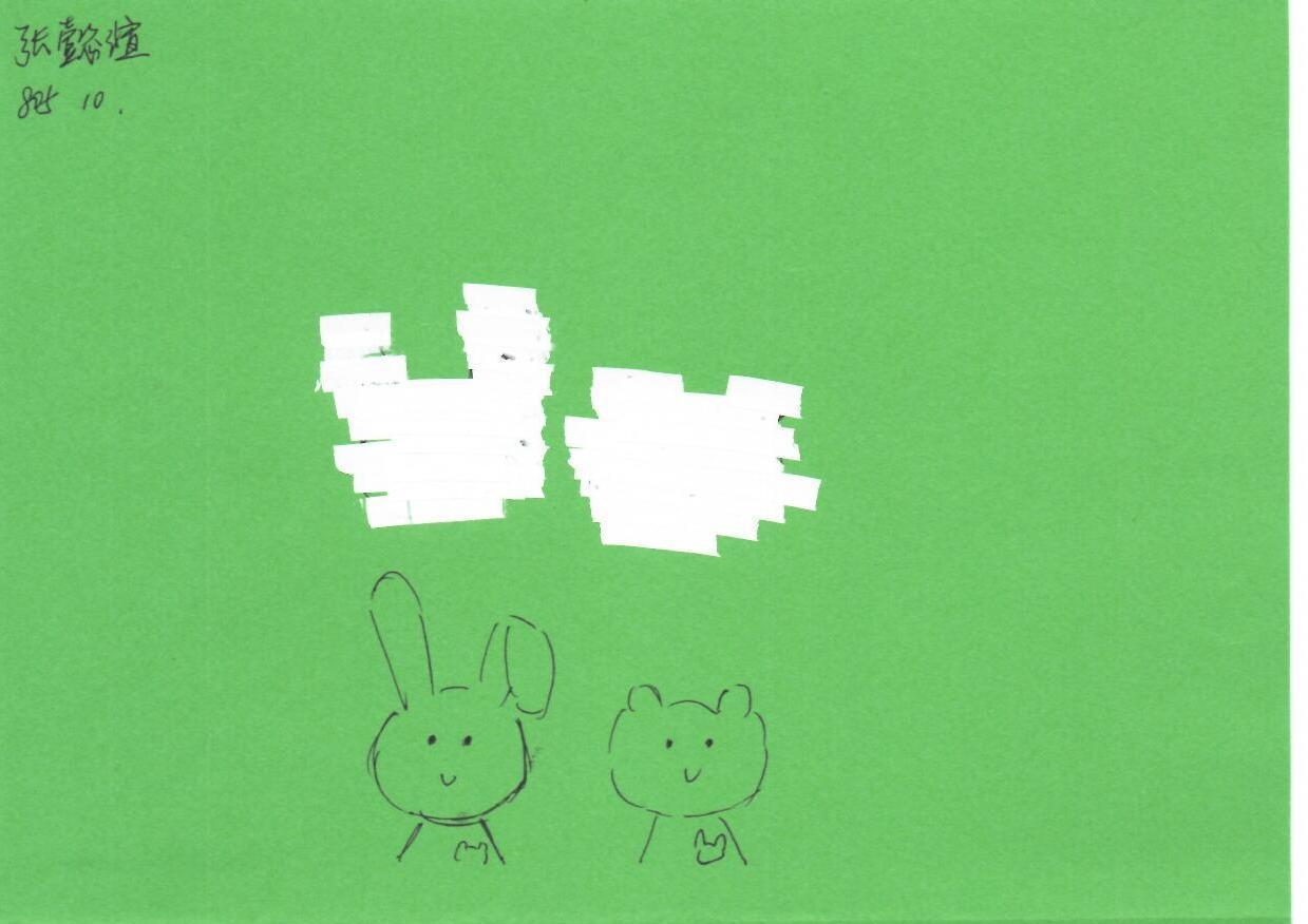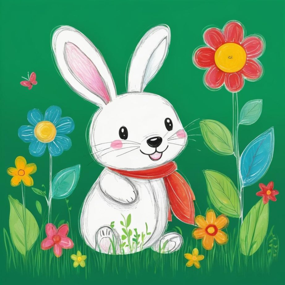 这幅作品展示了一片绿色背景上的简单线条画,描绘了一个兔子和一个熊的形象。两者都带有微笑的面部表情,传达出一种纯真和快乐的情感。白色的涂抹部分可能是未完成的元素或故意留白,增加了画面的趣味性和神秘感。
