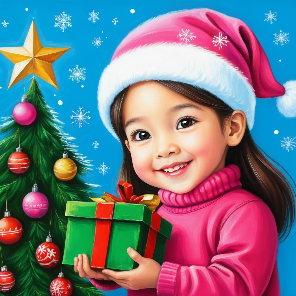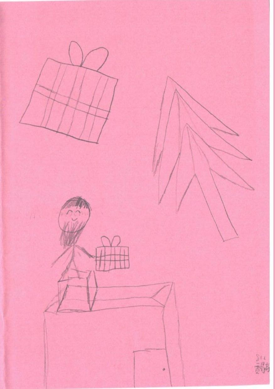 这幅简单的儿童画作以其纯真和直接的表现手法,捕捉了节日的欢乐与温馨。粉色的背景充满了柔和与温暖,呈现出一种宁静而愉悦的氛围。孩子的笑脸和手中的礼物,传达了期盼和喜悦,而旁边的圣诞树象征着节日的到来。这种简单的线条和构图,尽管没有复杂的细节,却在情感上深深打动人心。