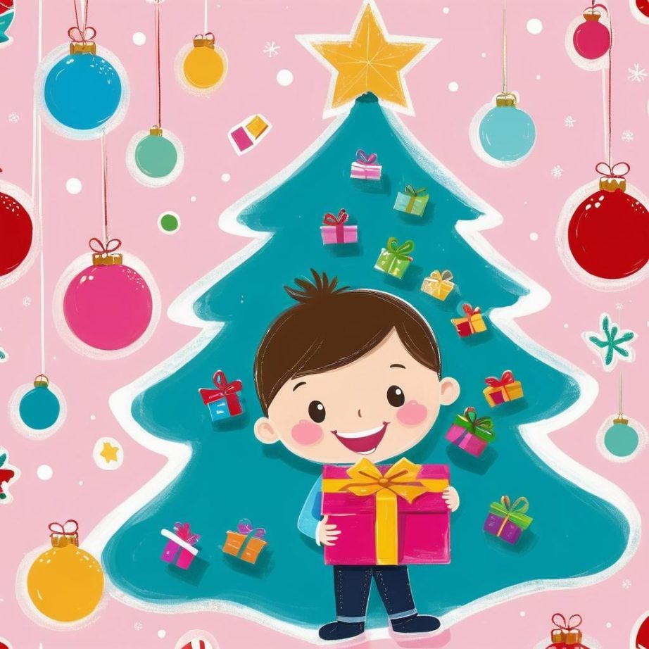 这幅画呈现了一种简单而温暖的氛围,背景为粉色,代表着柔和与温馨。画中有一个笑容满面的孩子,手捧礼物,旁边是一棵圣诞树和另一个漂浮在空中的礼物。线条简单,构图轻松,表达了一种期待与喜悦的情感,可能是在描绘节日的欢乐时光。