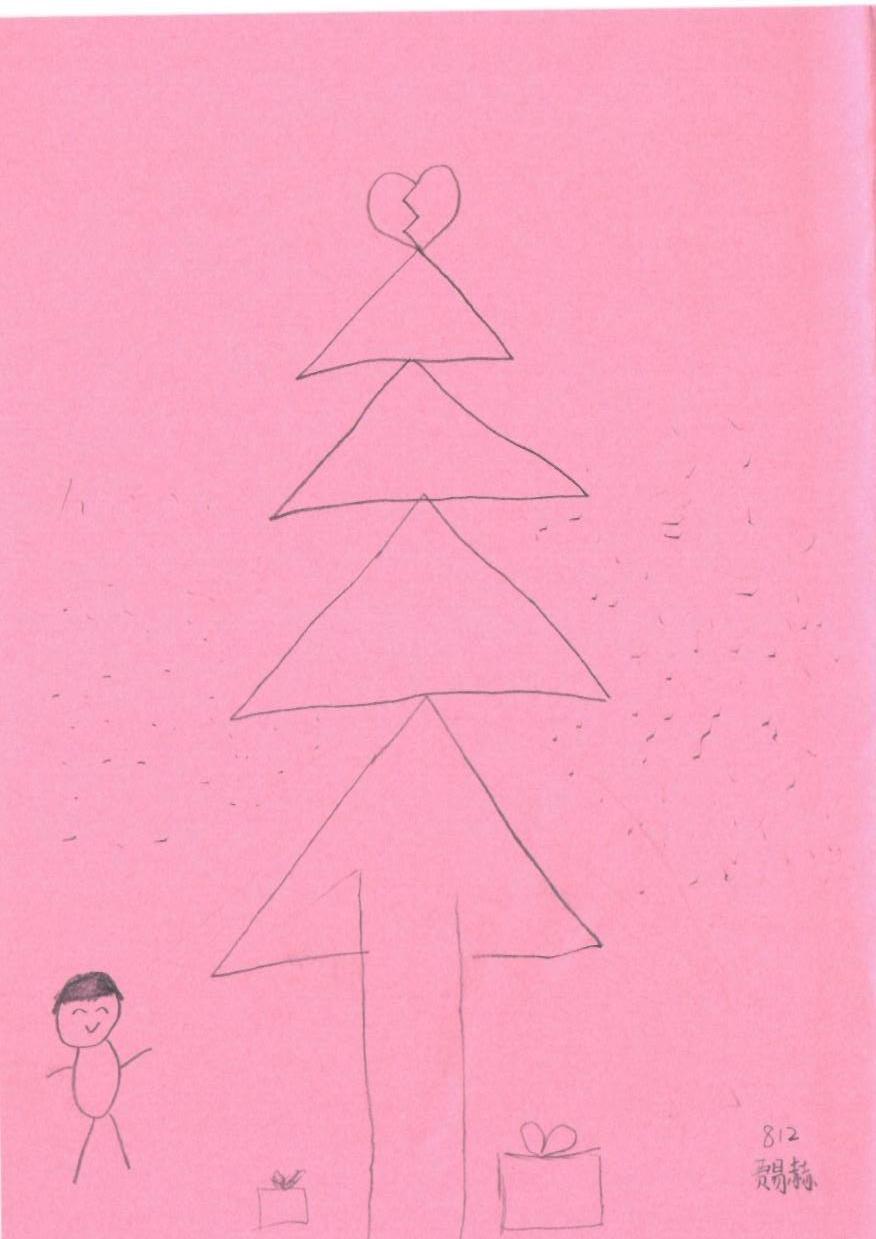 这幅画以简单的线条和单一的色彩,捕捉了儿童对节日的纯粹感受。圣诞树和礼物象征着节日的喜悦,而破碎的心形却为作品增添了一层深意,或许是对某种不完整情感的表达。这种情感的二元性,使得作品在简单中透露出丰富的内涵。