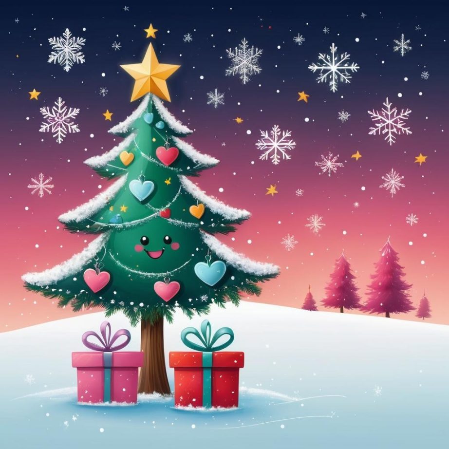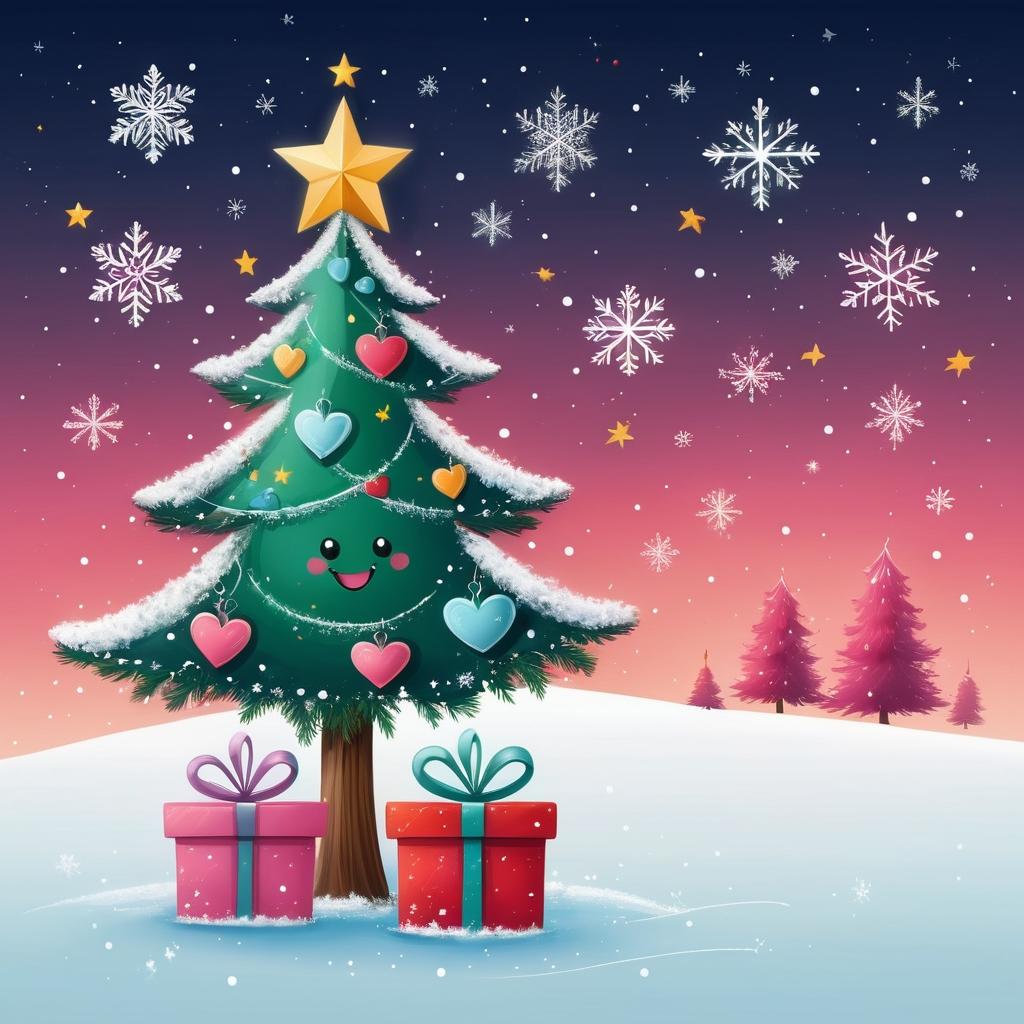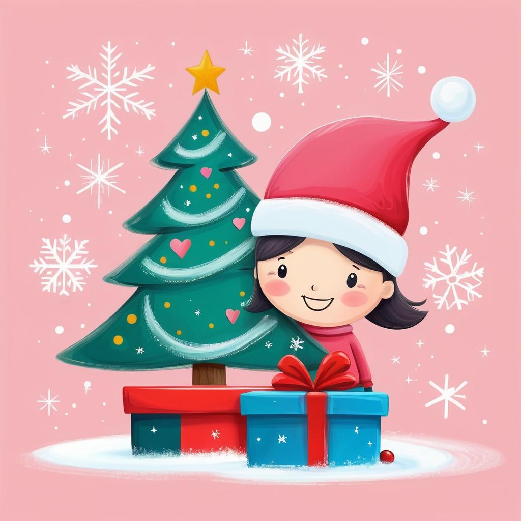 在这幅简约的儿童画中,我们看到了一个充满节日气息的场景:一棵圣诞树傲然挺立于画纸中央,顶部是一个裂开的心形,似乎在讲述一种复杂的情感。旁边的小人微笑着,仿佛对这节日充满了期待和欢乐,而脚下的礼物盒则增添了一丝神秘和惊喜。粉色的背景柔和而温暖,与画中元素形成鲜明对比。