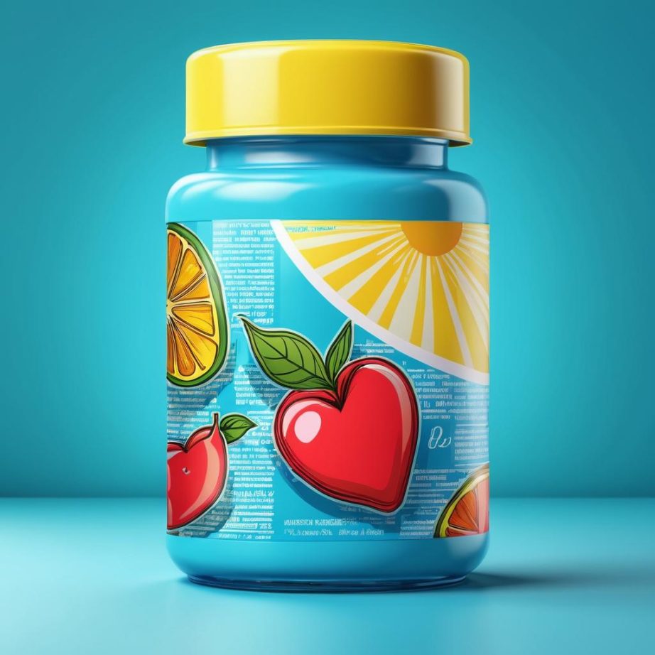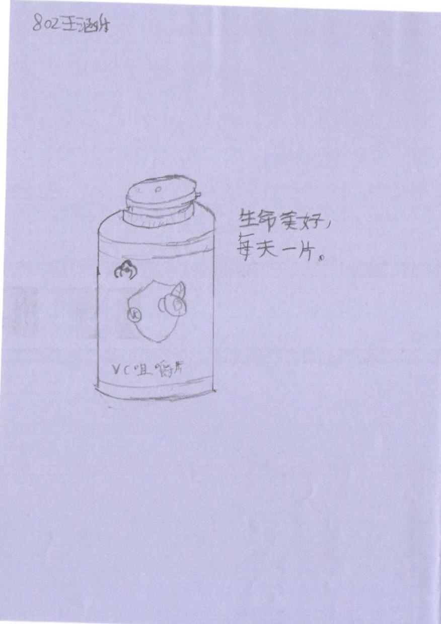 这幅作品是一幅简单的素描,描绘了一瓶维生素片剂的图像。画面左侧有一只瓶子,瓶身上有一些符号和文字,旁边写有广告词:’生命美好,每天一片’。整体风格朴素直白,线条简洁,传达了一种健康和生活积极向上的态度。
