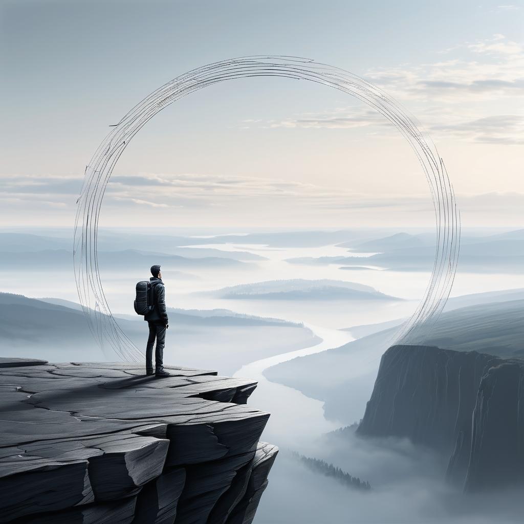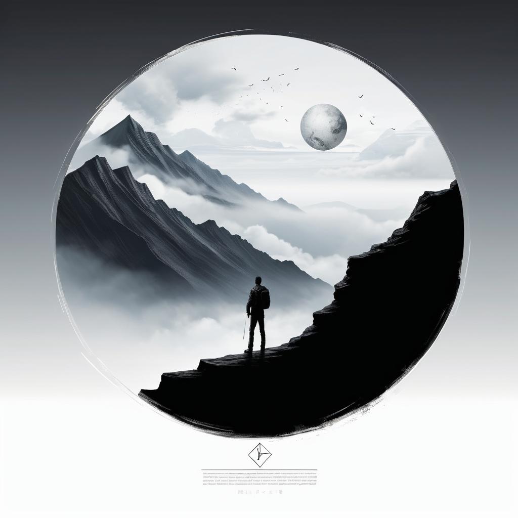 这幅作品使用了简单的线条和空白背景,展示了一个站在悬崖边的简笔画人物、一个圆形物体和一个三角形结构。整体风格简洁,似乎意在表达一种孤独感或冒险精神。创作者可能试图通过极简的手法来传达一种纯粹的情感或哲学思考。