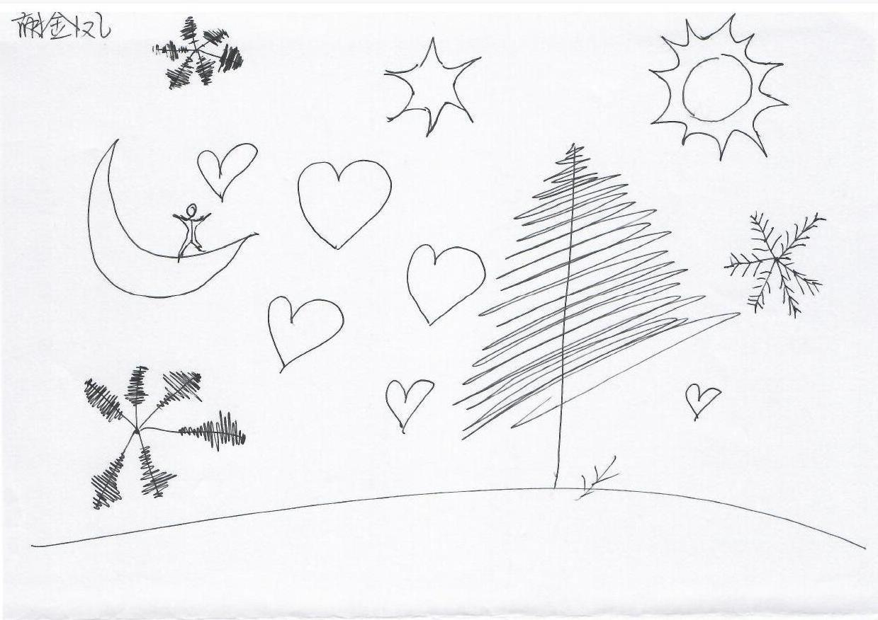 这幅图画采用了简单的线条勾勒出多种元素:月亮、星星、太阳、心形、树和雪花。整体构图富有童趣,给人以梦幻和温馨的感觉。画面表达了一种对自然和宇宙的浪漫想象,可能传达了纯真、希望和爱。