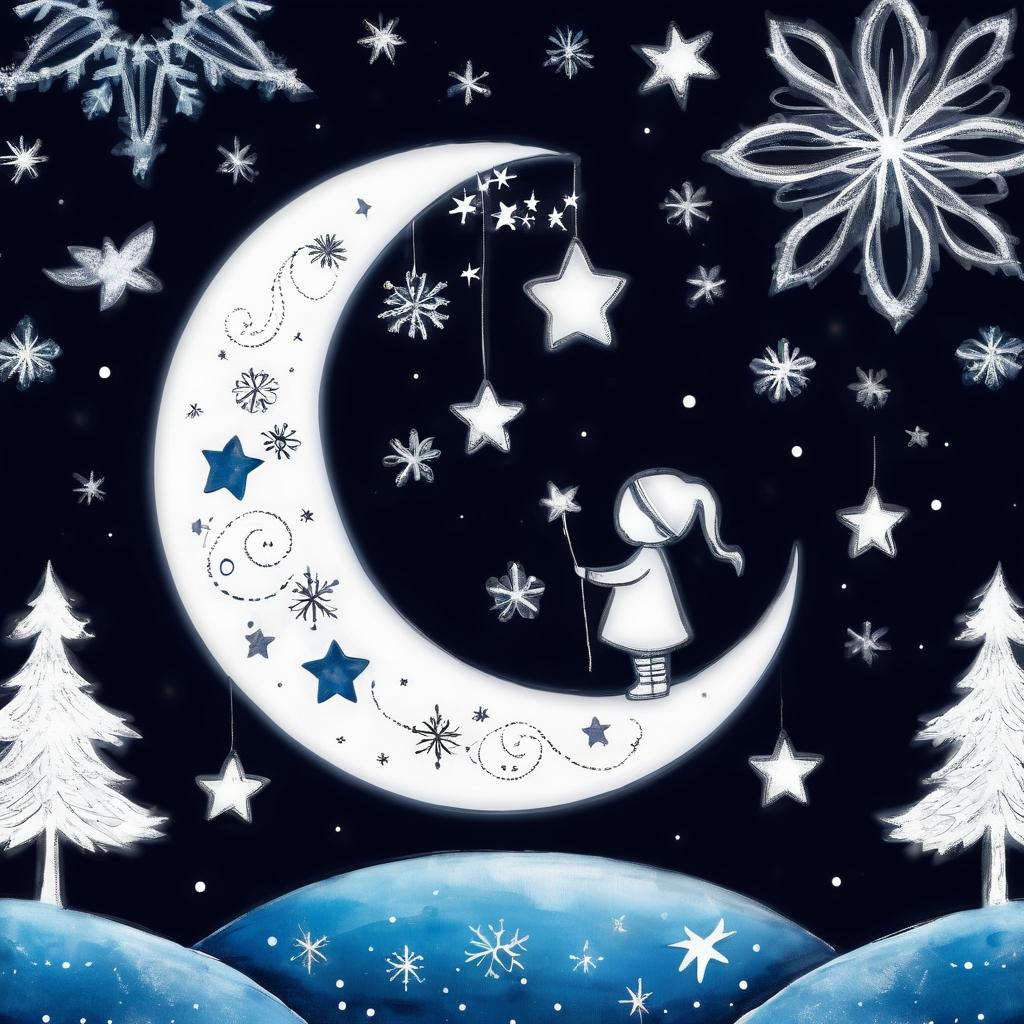 这幅作品的简洁线条和丰富想象力让人联想到儿童的无拘无束。可以通过增加颜色来提升作品的表现力,例如,用温暖的色调为心形涂色,用冷色调表现雪花的冰冷质感。同时,可以增加背景的细节,如云朵或星空,营造更加立体的空间感。为了增强情感表达,可以在月亮上的人物周围加上光晕,让画面更具神秘和梦幻的氛围。这种调整将使作品更具视觉冲击力,并保留其童趣和创意,适合用于儿童文学插图或卡片设计。