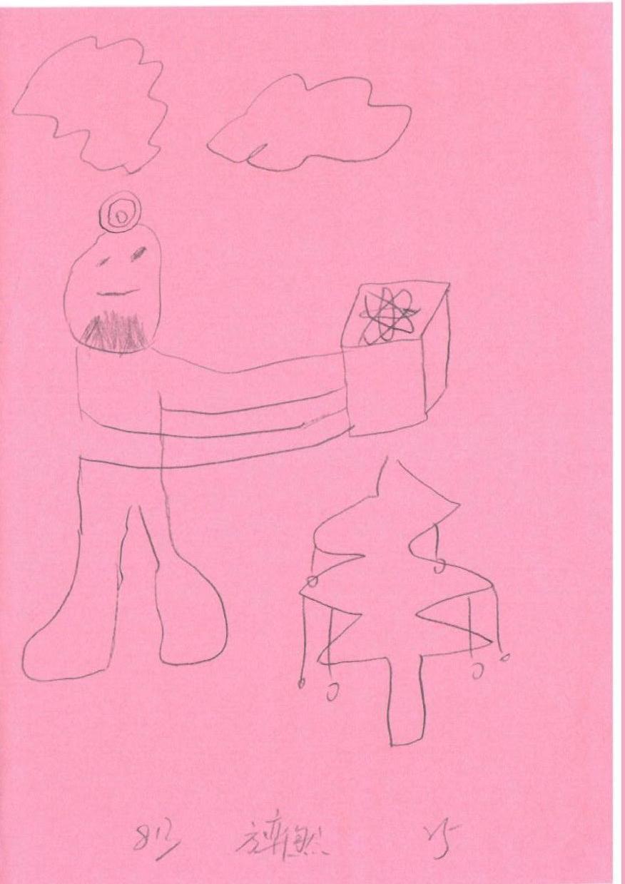 这幅作品展示了一个孩子的想象世界,使用简单的线条在粉红色的背景上勾勒出一个人物和一些抽象物体。人物似乎在拿着一个方块,上面有一个原子图案,旁边还有一个类似圣诞树的形状。整体构图充满了童趣与简单的快乐,传达了一种纯真的世界观。