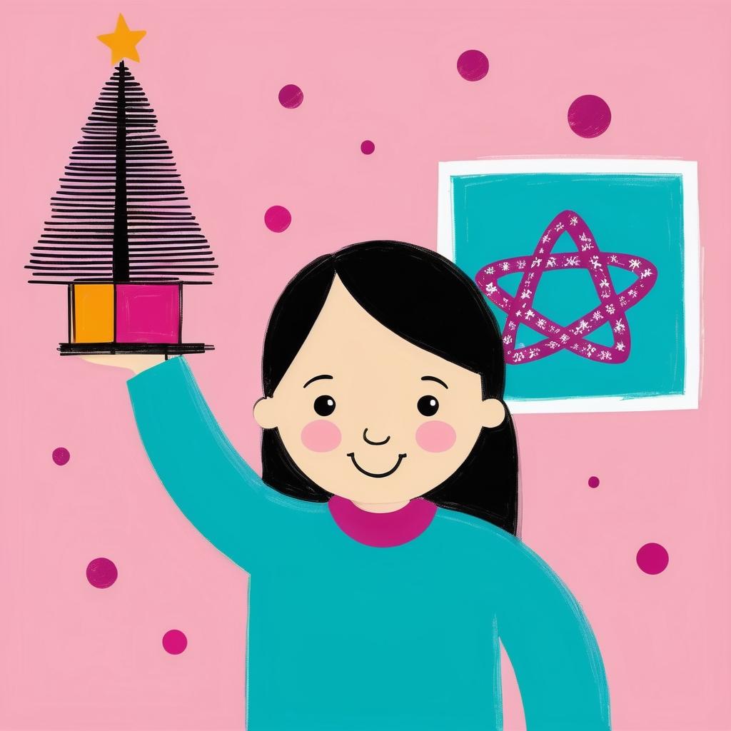 这幅作品是一位小朋友充满想象力的创作,用简单的线条和形状在粉红色的纸上勾勒出一个神秘的世界。画中人物手持一个方块,上面印有原子图案,似乎在探索科学的奥秘。旁边的图案则像是一棵圣诞树,提醒着观赏者节日的温馨氛围。整个画面充满了童趣与简单的快乐,仿佛可以窥见孩子心中那份对世界的好奇与探索。作为儿童艺术专家,我们可以从中看到孩子们如何用最直接的方式表达他们的内心世界。通过这幅作品,建议在儿童创作中鼓励使用更多颜色和细节,这不仅可以提高他们的艺术表现力,还能激发他们的创造潜能。丰富的色彩和元素的加入可以让画面更具层次感,与此同时,也让孩子们能更深入地表达他们对世界的理解和感受。