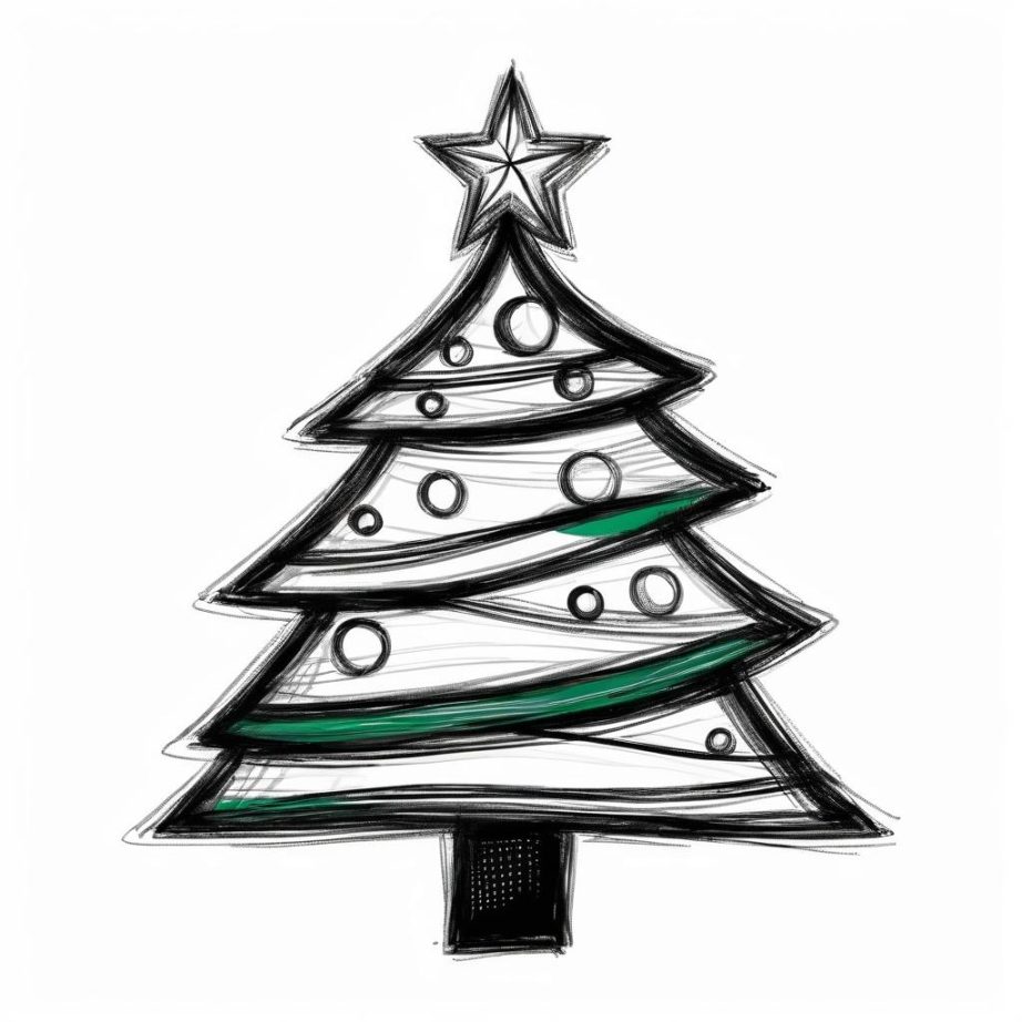 这幅作品展现了一棵简约风格的圣诞树,顶部有一颗星星,树枝呈现出几何形状。树干旁边隐约有一片披萨装饰,增添了趣味性。整体以黑色线条勾勒,背景为白色,给人以简洁明快的感觉。这个创作可能意在传达一种幽默感和节日氛围的轻松表达。