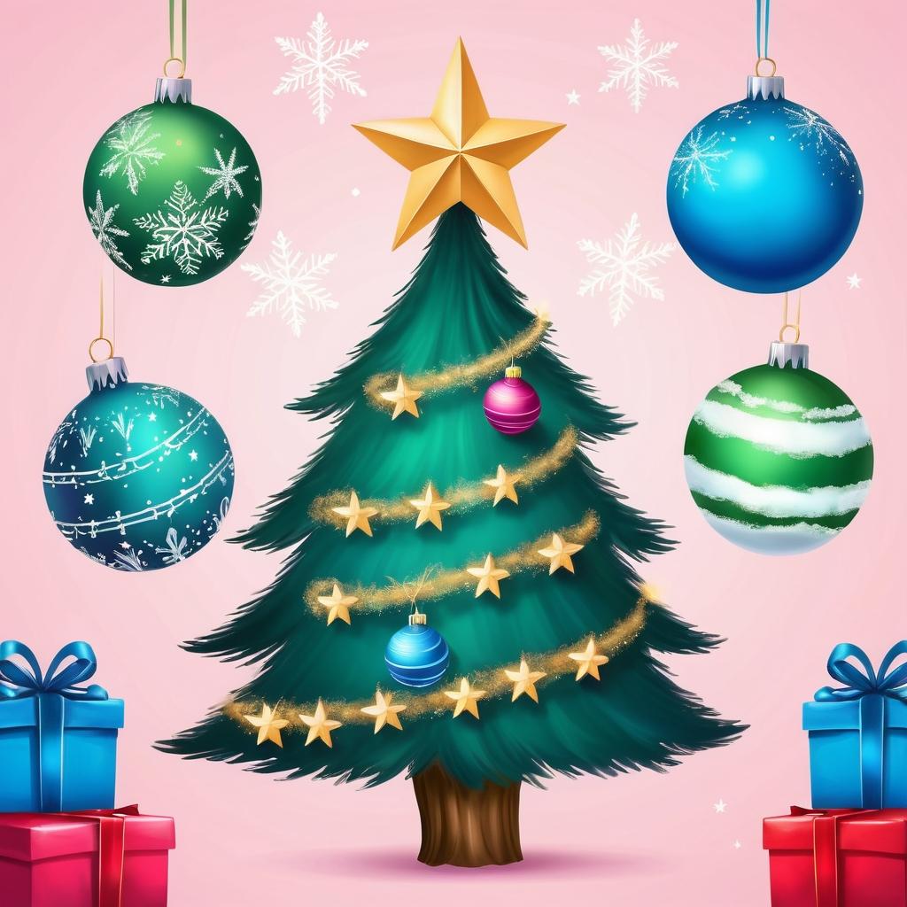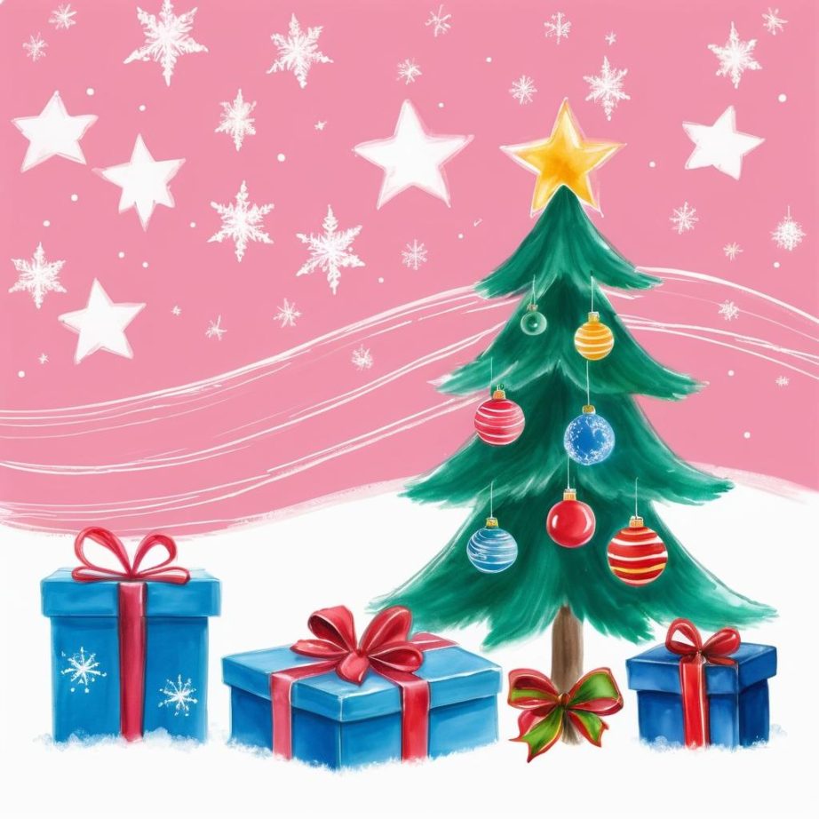 这幅作品是一幅简单的铅笔画,描绘了一棵装饰着星星和球形装饰品的圣诞树。背景是粉红色的纸张,给人一种温馨、柔和的感觉。树顶有一顶圣诞帽,增强了节日的氛围。画面的整体构图简洁,线条轻盈,传达出一种轻松愉悦的情感。