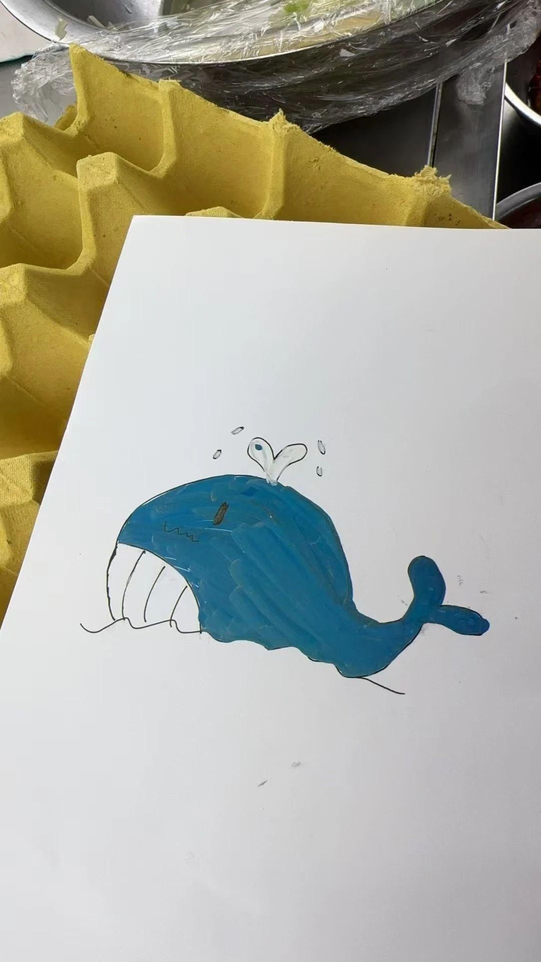这幅画展示了一只简约风格的蓝鲸,采用蓝色为主色调,形状简单且具有卡通风格。鲸鱼的表情愉悦,喷出的水花增添了动态感。背景使用了空白画纸,使得鲸鱼形象更加突出。作品传达了一种轻松、快乐的感觉,可能意在表现海洋生物的可爱与童趣。