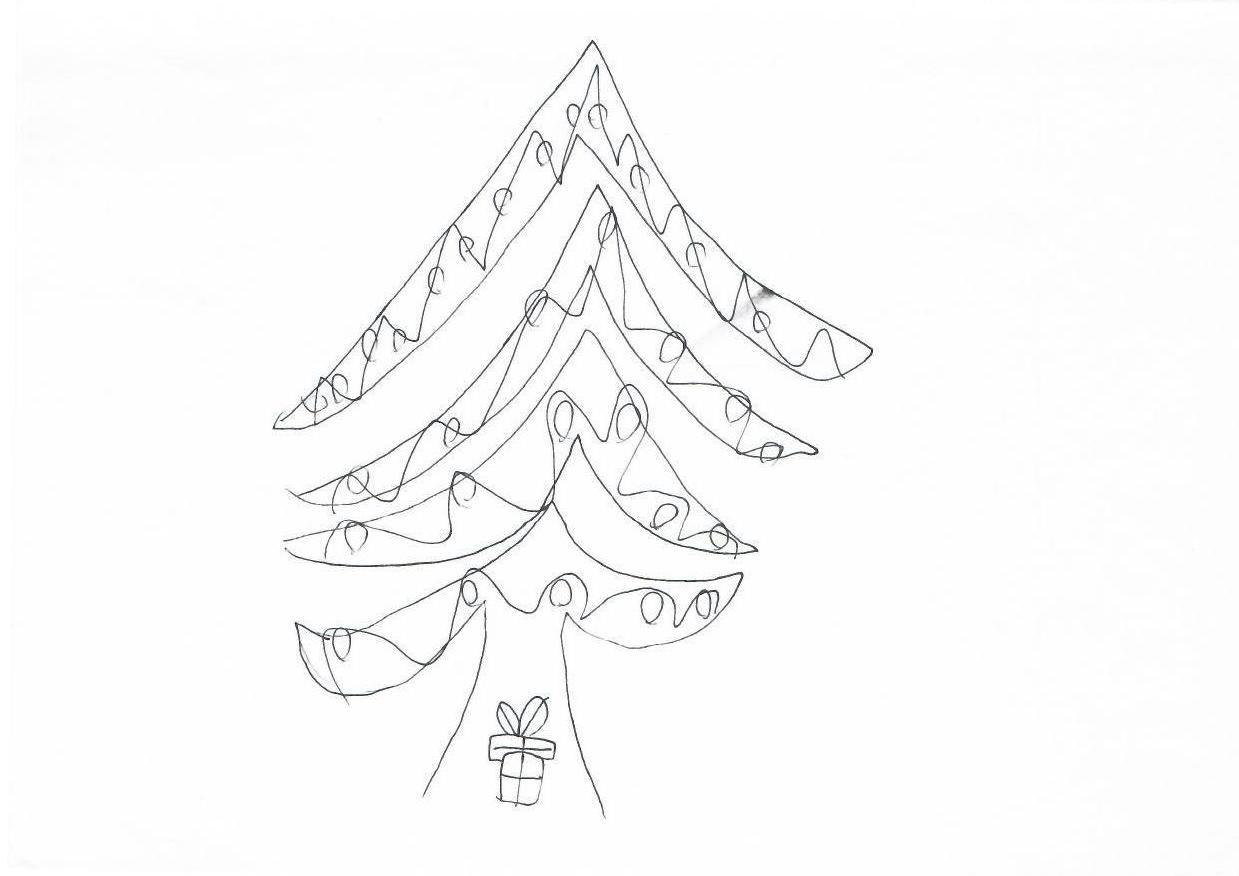 这幅画是一幅简单的线条画,描绘了一棵圣诞树。树上有波浪形的装饰,底部有一个礼物盒。整体构图简单明了,线条流畅,表达了一种简约而欢快的情感,可能传达了节日的喜悦与期待。