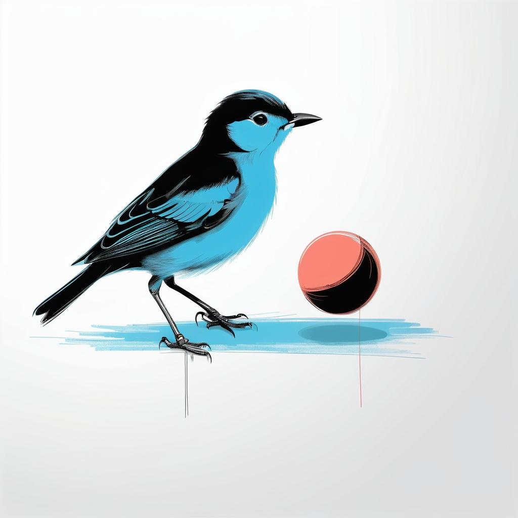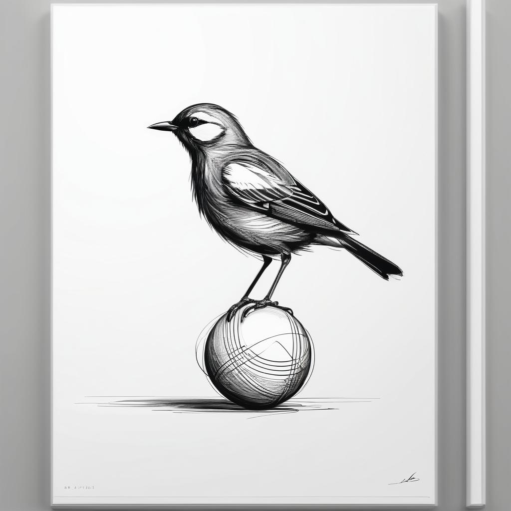 为了使这幅作品更具艺术深度,可以考虑在背景中加入一些柔和的色彩,增加画面的层次感。同时,增加鸟与球之间的动态互动线条,可以提升作品的趣味性和叙事性,使观者不仅仅是看到一幅画,而是感受到其中的故事。通过这样的调整,作品不仅保留了其简约的魅力,还能更加生动地传达主题。