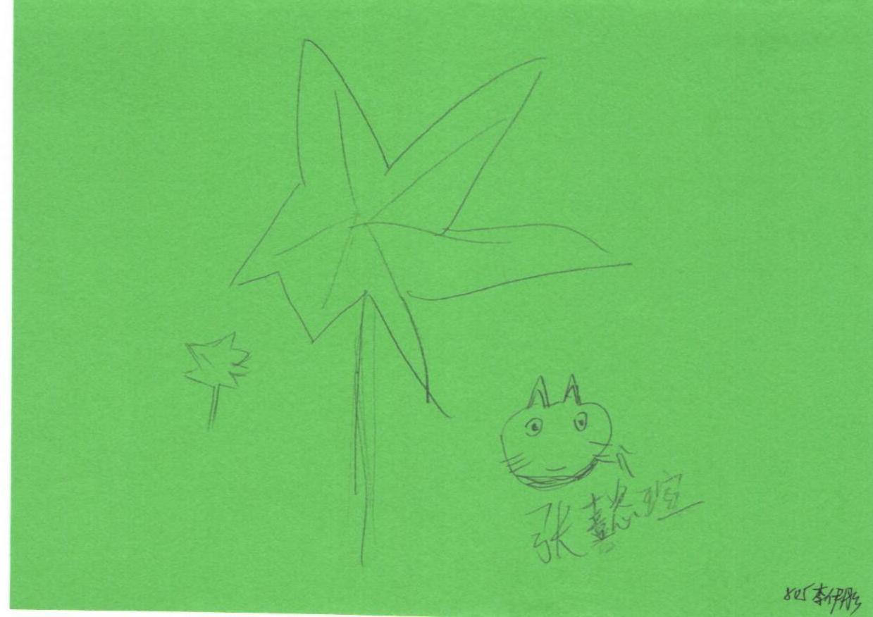 图片展现了一个简单的铅笔画,背景为绿色纸张。画中有一只简化的小猫面部图案,以及几何形状的风车和叶子元素。这些元素以线条勾勒,展现出一种天真和简单的美学。创作者可能想传达一种童趣和自然的和谐。