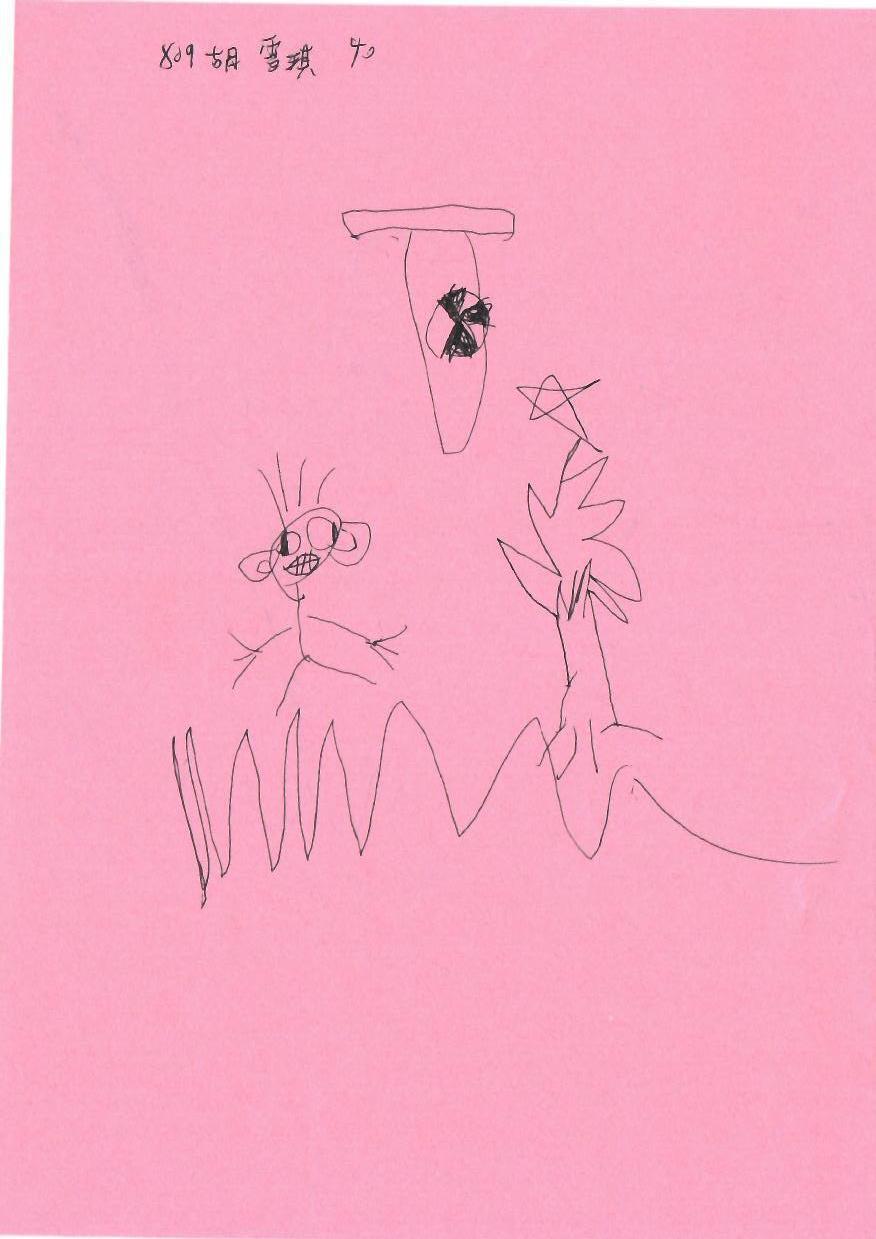 这幅图展示了一个手绘的人物形象和一颗简约的树木,背景是粉色纸张。人物的姿态简单,面部特征突出,可能表达了欢乐或惊讶的情绪。树木的形状可被视作圣诞树的抽象表现。虽然没有明显的节日装饰,但通过添加圣诞元素可以转化为节日主题。