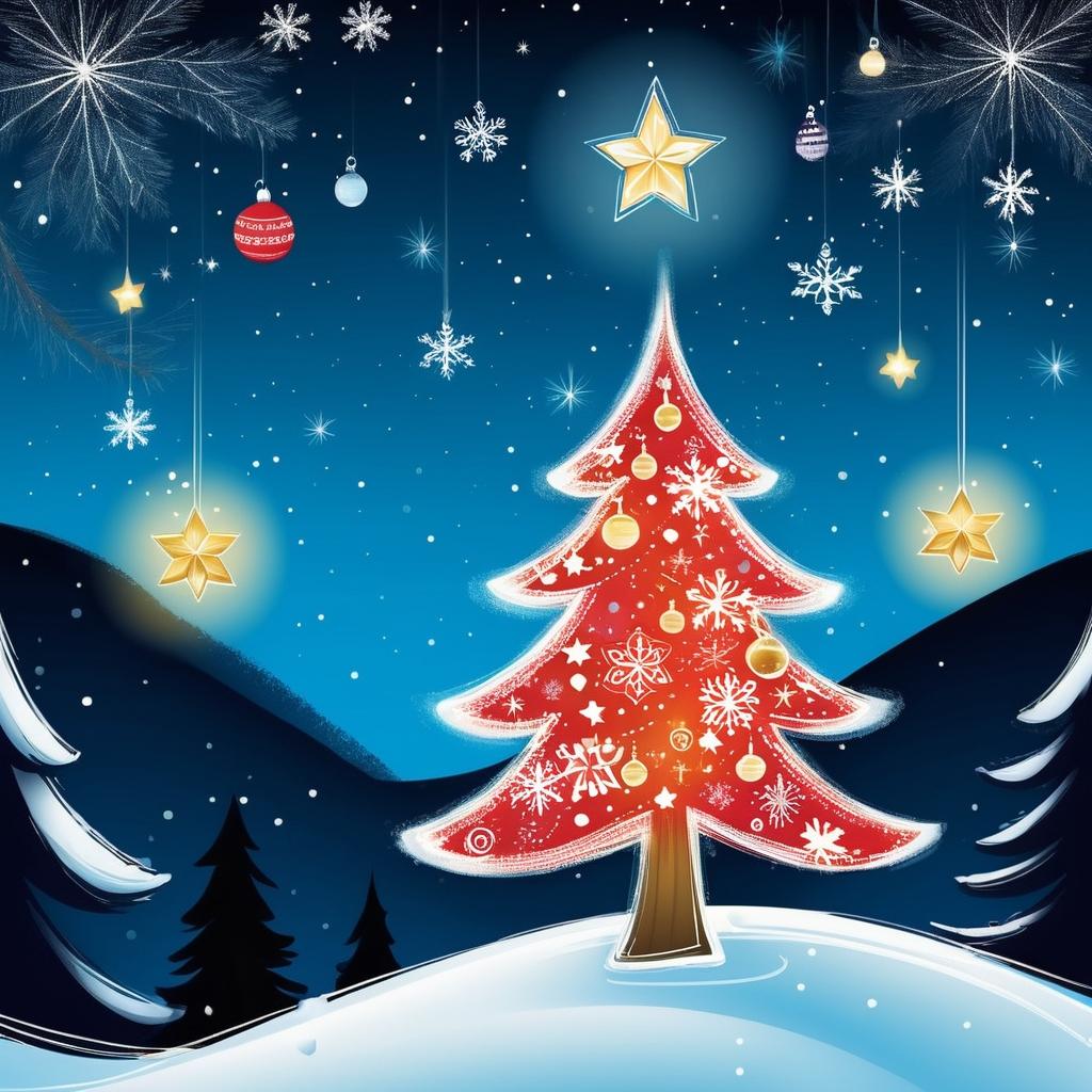 将人物的表情作为贺卡的情感核心,融入温馨的圣诞场景。可以在树上添加圣诞装饰,如彩色灯泡和星星顶饰。背景使用柔和的雪景和暖色灯光,增强节日氛围。